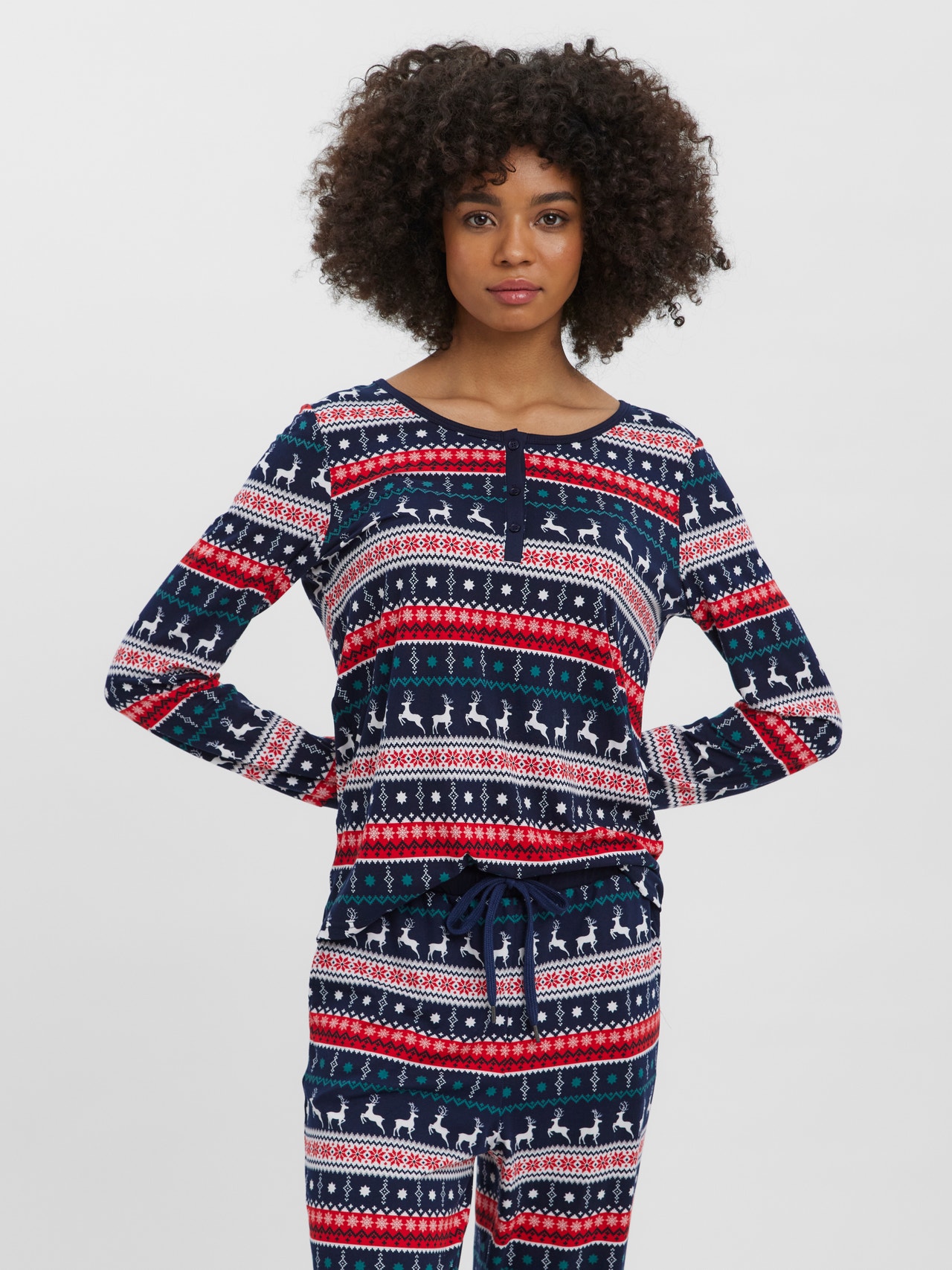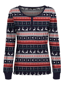 Long-sleeve jersey top in Christmas print with a round neckline and a button detail in the front. Wear it with a pair of jeans and a cool vest for a perfect winter look.
