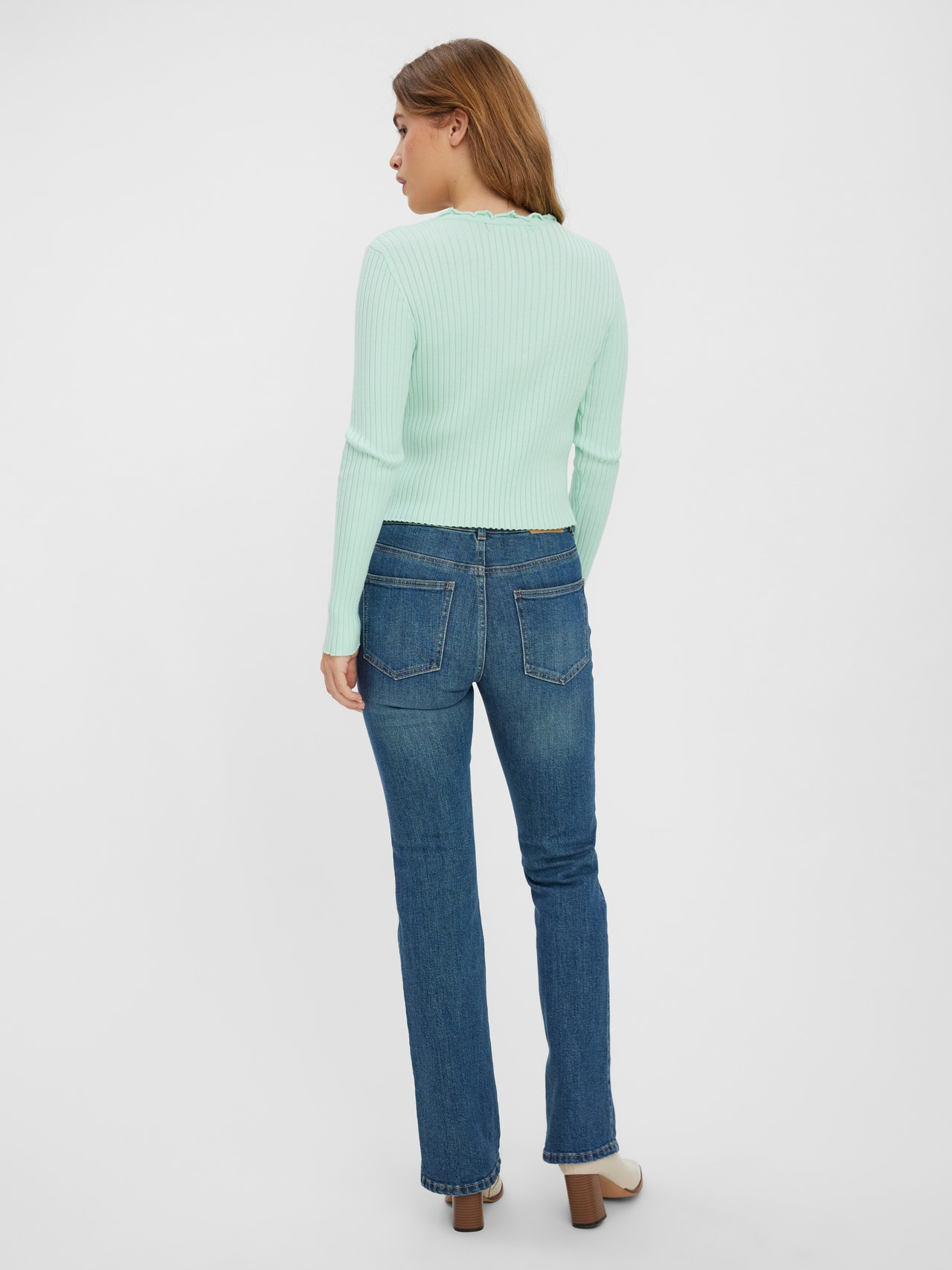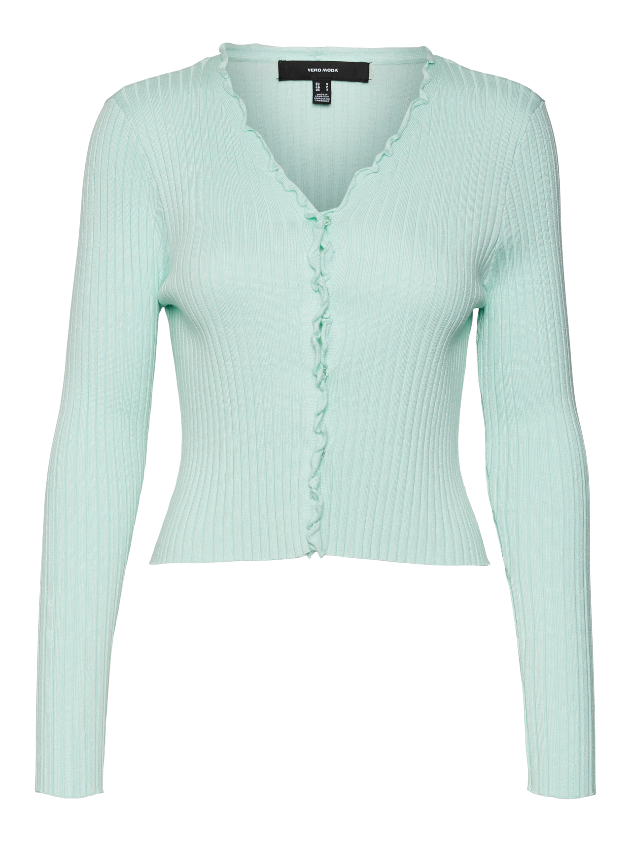Knitted cardigan in a ribbed structure with frills at the neckline and hem. Style this cute cardigan with a pair of loose fit jeans and some heeled boots for a cute, stylish look.
