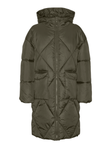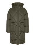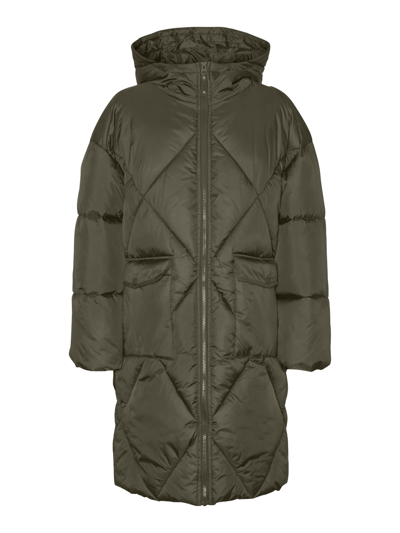 LADIES PADDED COAT WITH HOOD AND ZIPPER FOR CLOSURE. TWO FRONT POCKETS WITH PRESS BUTTONS FOR CLOSURE. ELASTIC AT BOTTOM AND ON CUFFS.