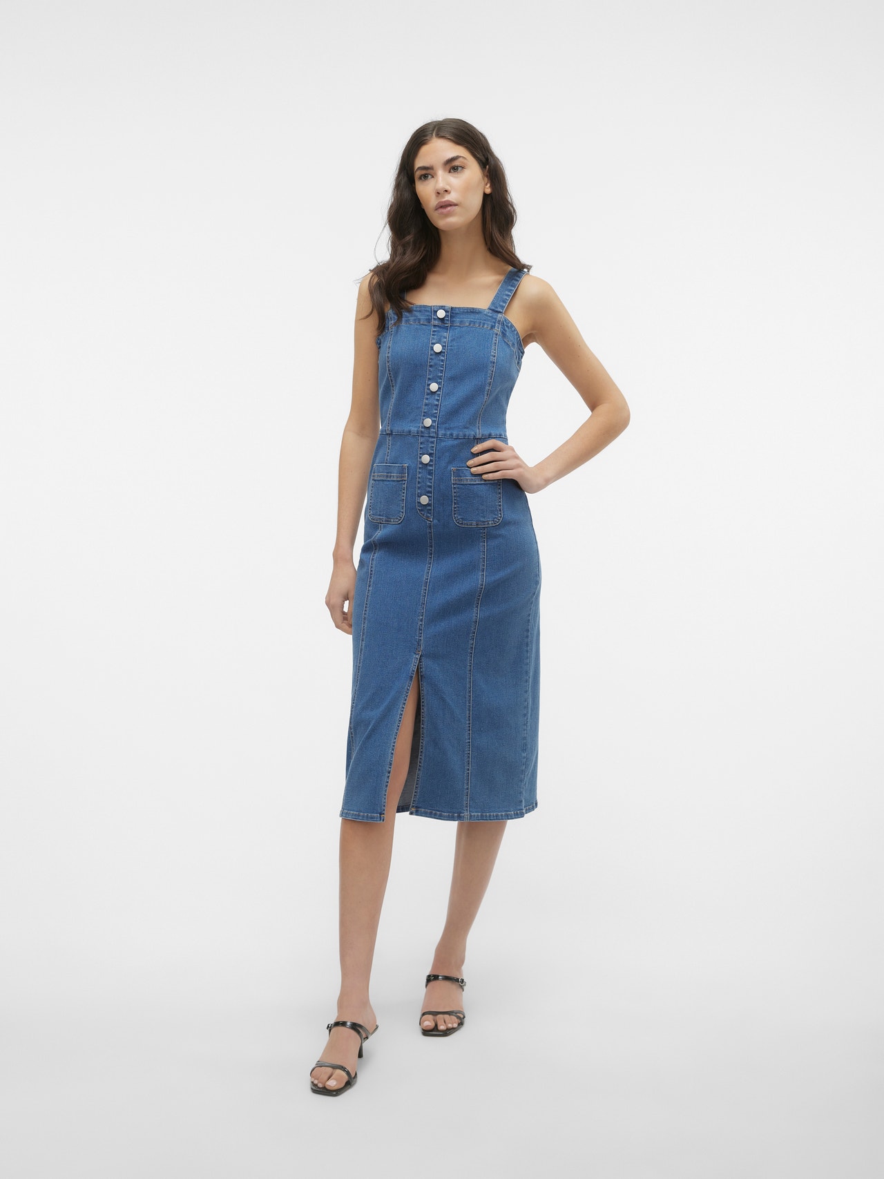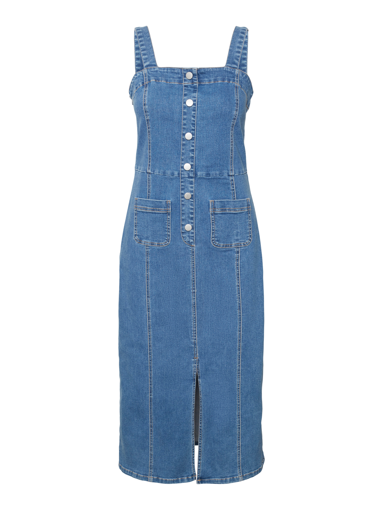 A maxi dress a day keeps any crises away. Maxi dresses are both elegant and feminine, and this one makes no exception. Style it with flat sandals for an easy, breezy summer look or add heeled pumps for a trendy evening look. - Product Type : Denim dress - Neck : Square neck - Sleeve : Sleeveless - Closing : Button fastening - Pockets : Front pocket - Extra details : Cut-out detail - Wash/Finish : Stonewash for a faded, worn look - Fit : Regular Fit