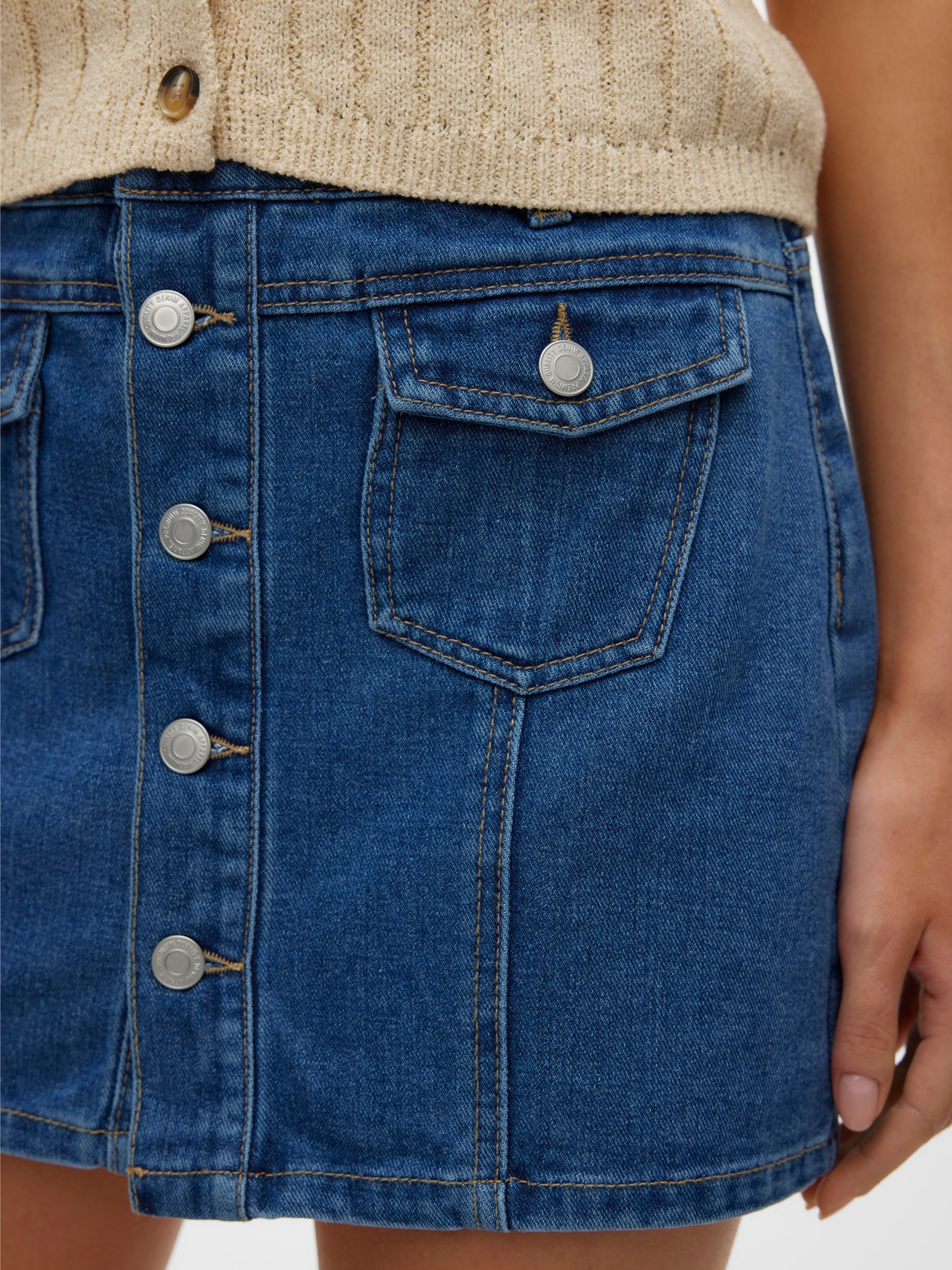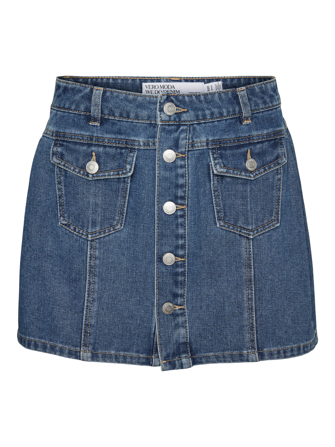 Denim is always a good idea, also when it comes to skirts. A true classic that you can style for everyday use any way you feel like. For a fun look - match it with a denim jacket and there you go!. - Product Type : Denim skirt - Closing : Button fastening - Pockets : Front pockets - Waist : Mid waist - Length/Size : Short - Extra details : Button detail - Wash/Finish : Stonewash for a faded, worn look
