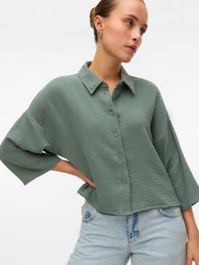 Basics are inevitable to find in almost every wardrobe out there. Our basic tops help bind an outfit together and this top makes no exception. Wear it with a shacket on top, a pair of relaxed mom-jeans, and chunky boots and you get a relaxed and cool everyday look. - Product Type : Blouse - Neck : Shirt Collar - Sleeve : 3/4 Sleeves (3/4) - Sleeves : Wide sleeves - Closing : Button fastening - Length/Size : Cropped - Fit : Loose Fit