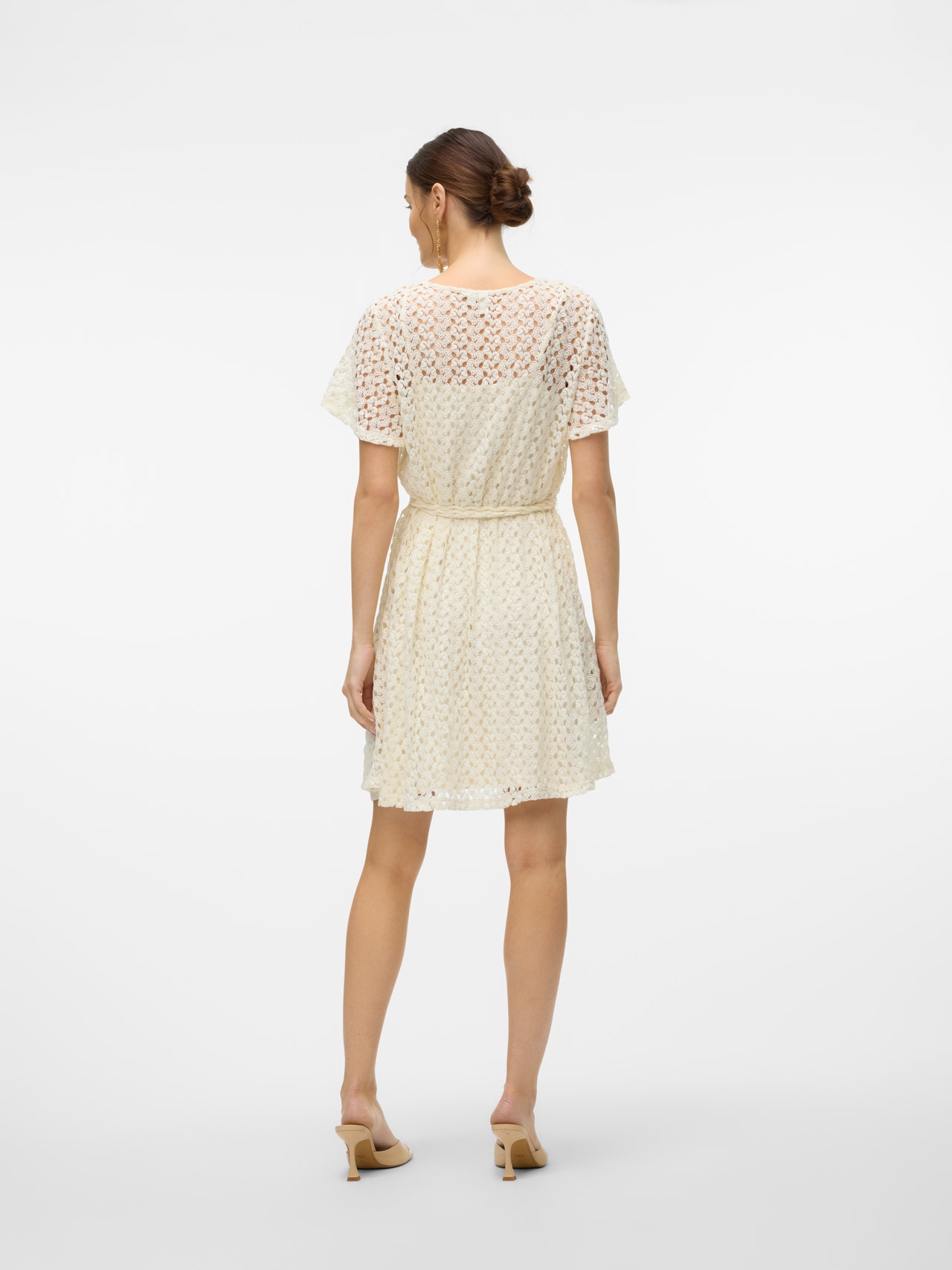 Make a statement in a beautiful mini dress. With heels and your favourite accessories, this dress provides a perfect evening-look. Whether you are enjoying the summer or going dancing you can never go wrong with a mini dress. - Product Type : Dress - Neck : Round Neck - Sleeve : Short sleeves - Sleeves : Wide sleeves - Closing : Belt fastening - Length/Size : Short - Lining : Cotton jersey lining for comfort and a soft feel - Extra details : Belt included, Lace detail - Fit : Regular Fit