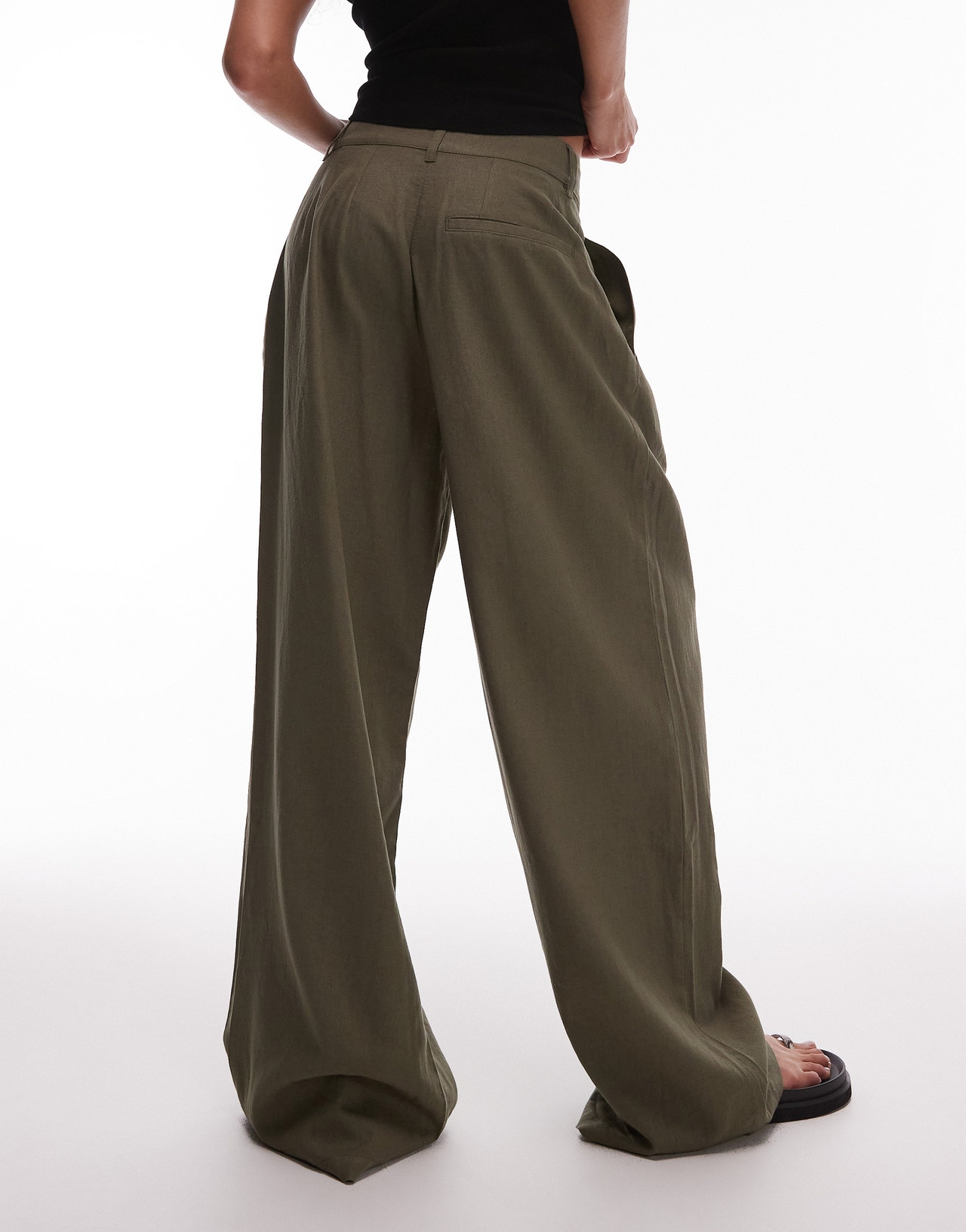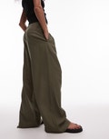 Topshop linen high waist double pleat trouser in khaki - BLACK