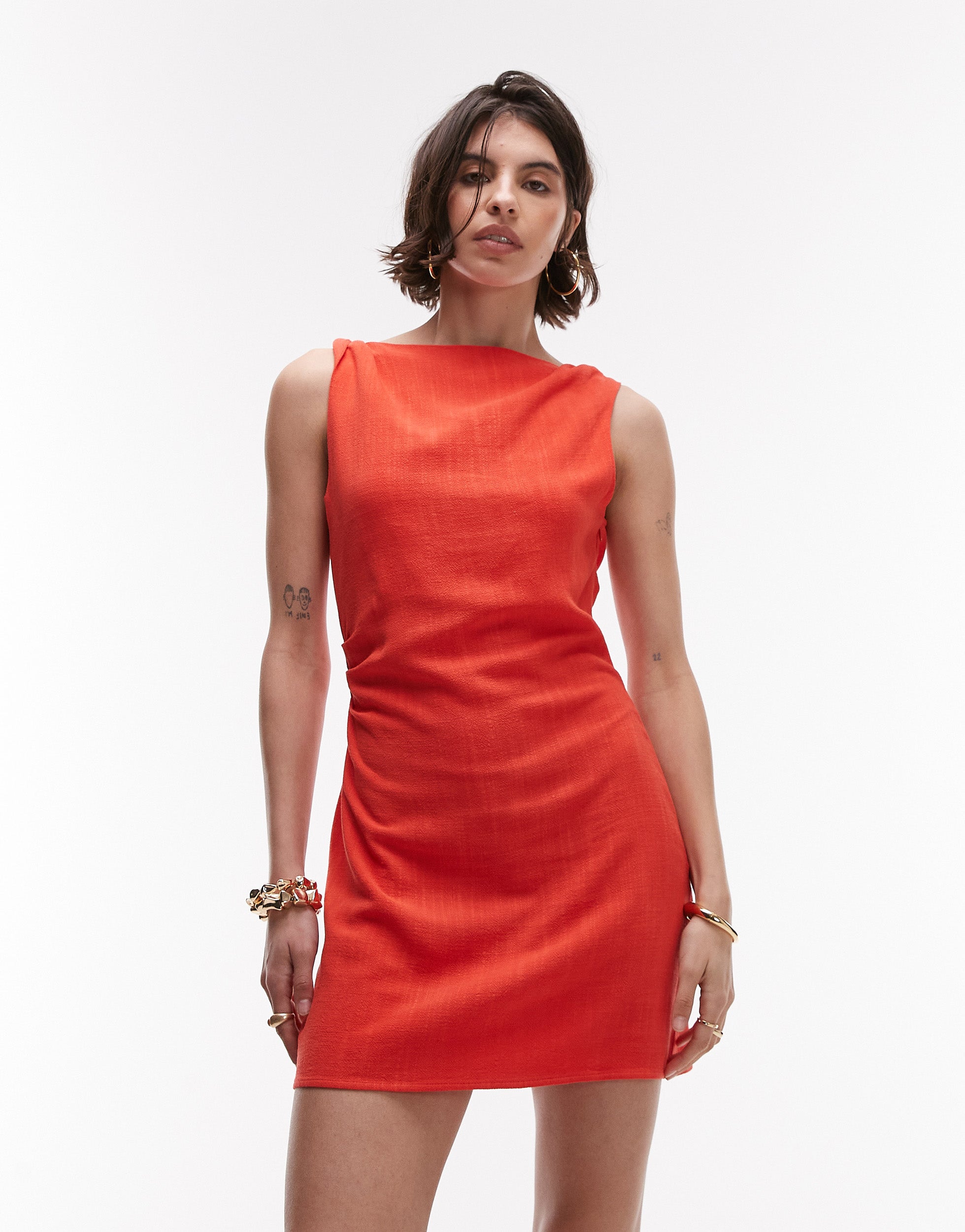 Topshop twist shoulder mini linen dress in red - RED
