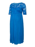 LADIES MATERNITY A-SHAPE DRESS. 3/4 LACE SLEEVES WITHOUT LINING WITH SCALLOP EDGE. BOAT NECK WITH LACE EDGE. LINING INSIDE DRESS AND UPPER PART OF BODY WITHOUT LINING. CUTLINE ABOVE BELLY AND GATHERINGS UNDER THE CUTLINE. ZIPPER AT SIDESEAM. A SATIN WEAVE BELT.