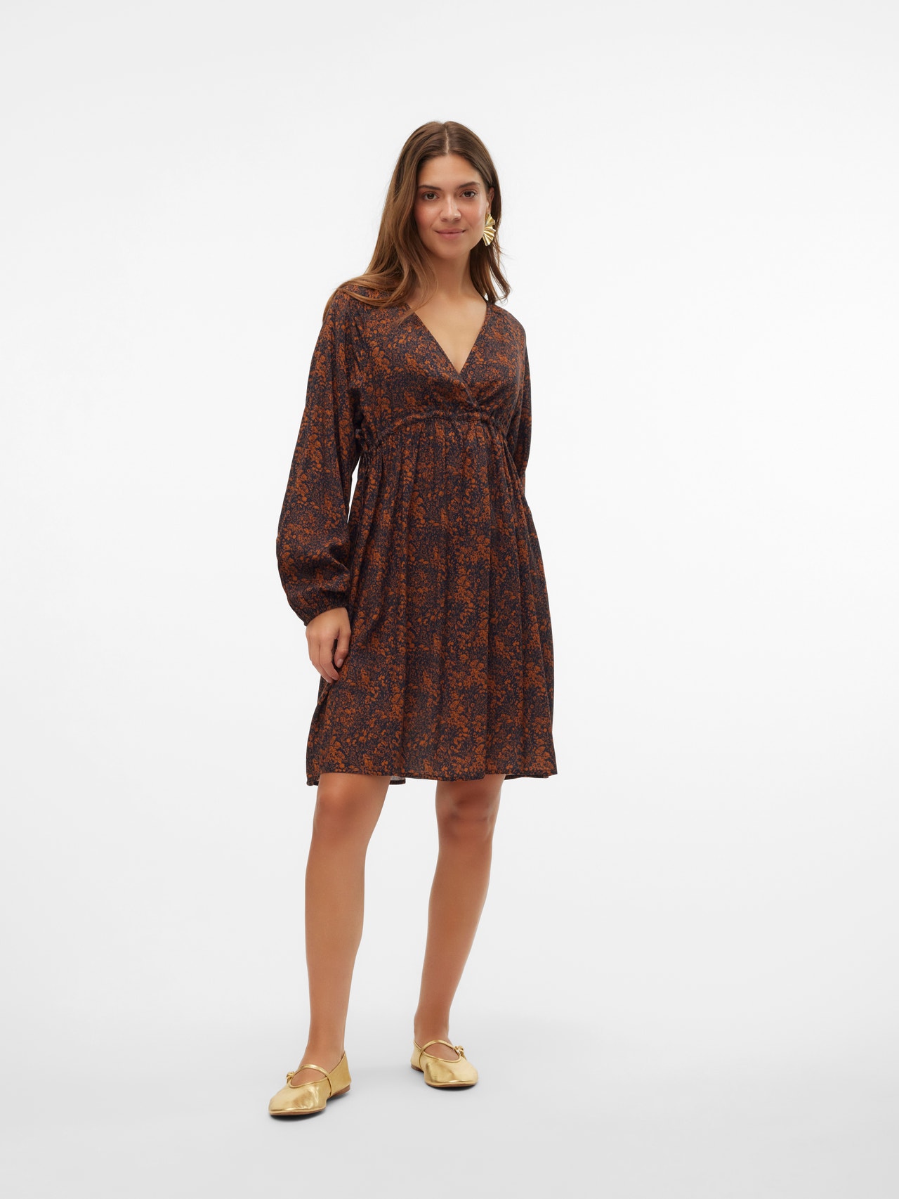 Add comfort and colour to your wardrobe with beautiful 2-in-1 dresses for both pregnancy and nursing. - Product Type : Dress - Neck : V-Neck - Sleeve : Long sleeves - Sleeves : Balloon sleeves - Cuffs : Elasticated cuffs - Closing : Belt fastening - Length/Size : Short - Extra details : Curved hem, Cutline above bump, Elasticated waist, Pleated detail, Smock detail, Nursing layer under a wrapped effect, Wrinkle detail - Print : Print repeated across the entire surface of the product - Fit : Regular Fit