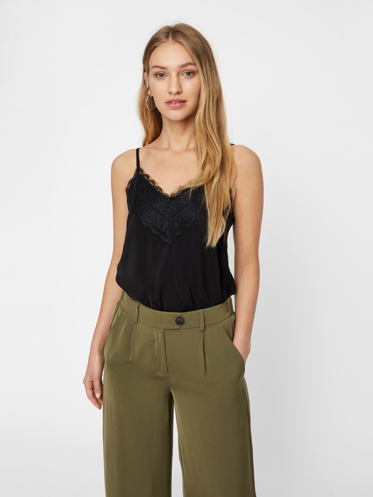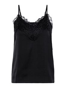 Singlet top with adjustable straps, lace at the neckline, and a V-neck. Style this beautiful top with a pair of trousers, an oversized blazer, and a pair of heels for a stylish look.