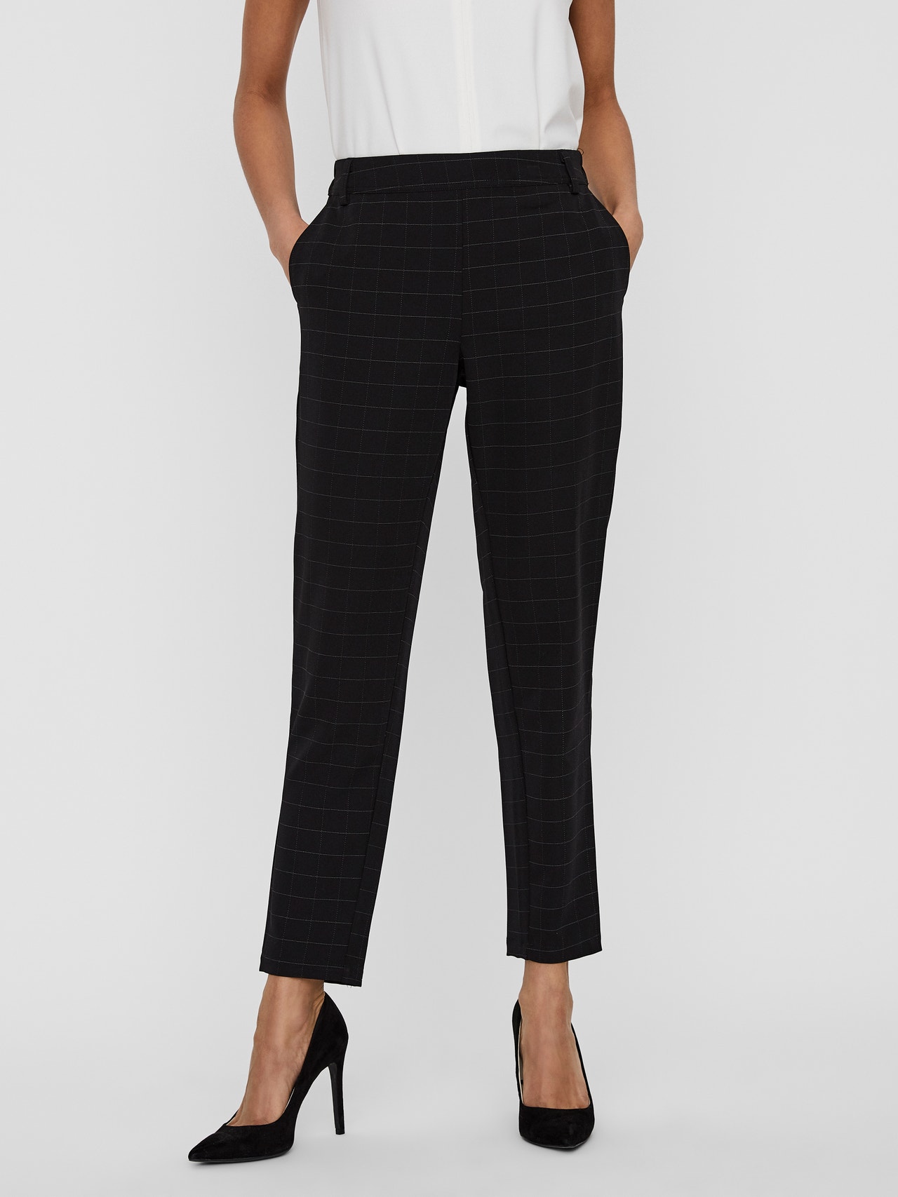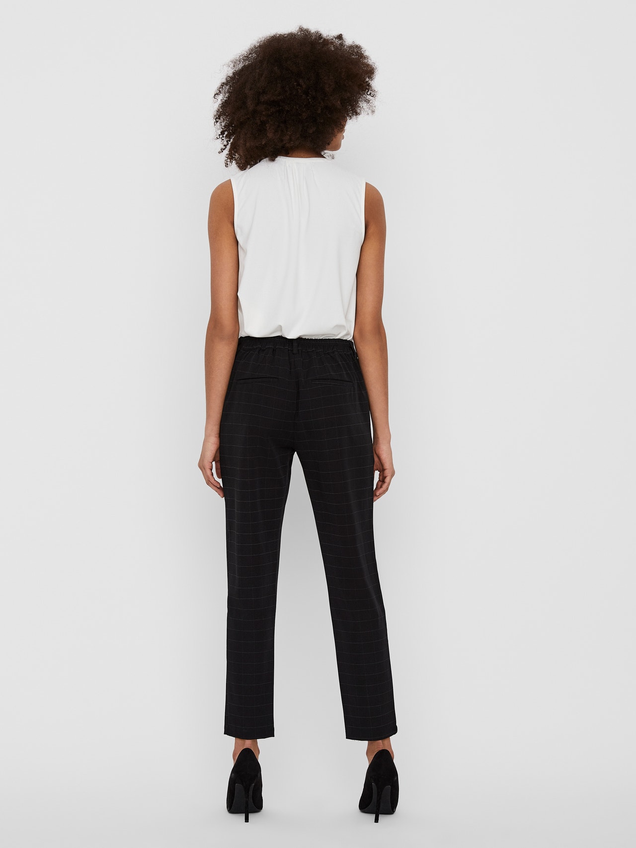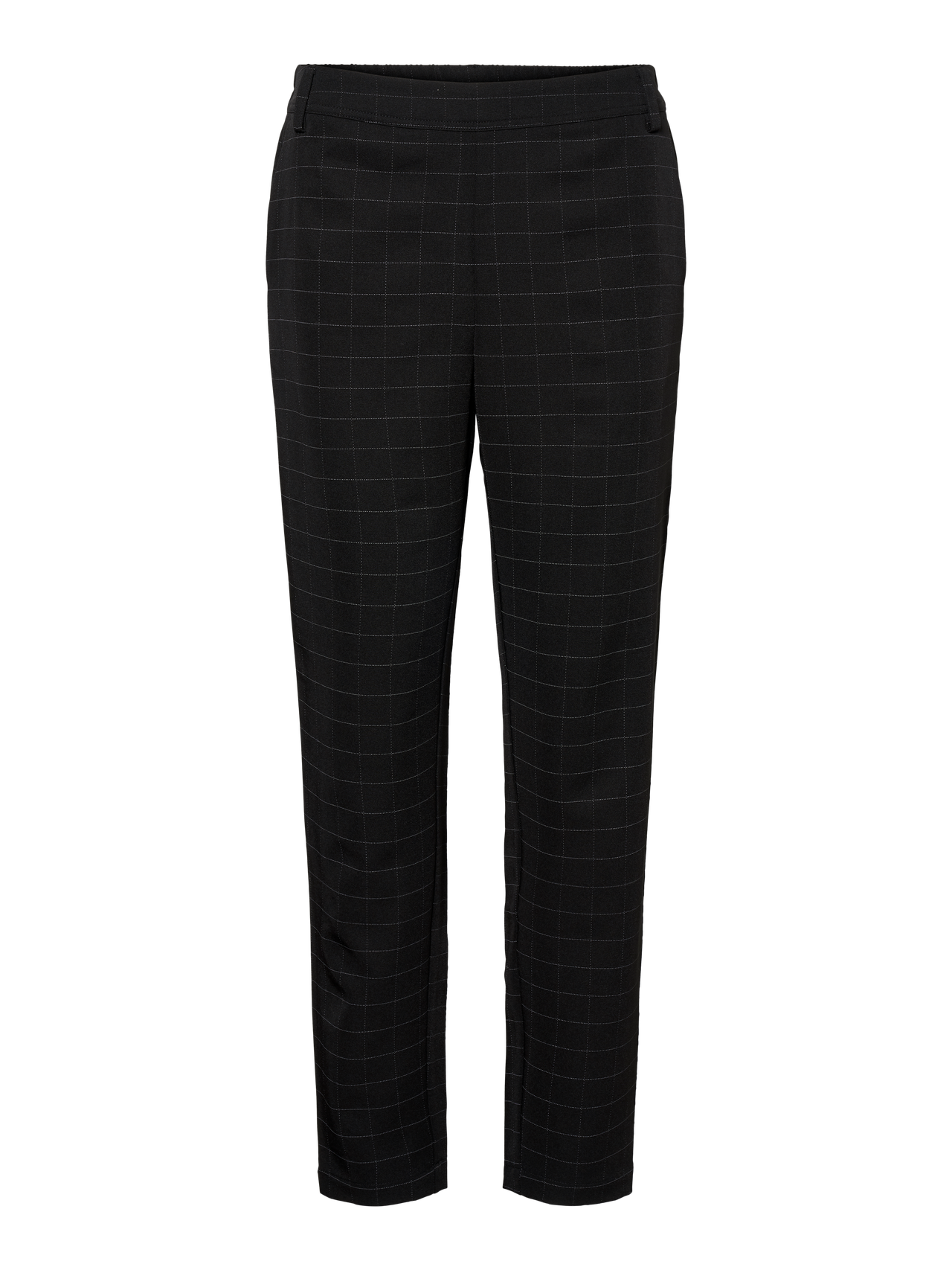 - Chequered trousers. - Normal waist. - Regular fit. - Soft and stretchy material. - Elastic waistband. - False pockets in the back. - Inseam 34: 76 cm in a size S. - The model is 177 cm tall and wears a size S. Chequered trousers with normal waist and an elastic waistband. Style the trousers with a shirt and high heels for an office-inspired look.