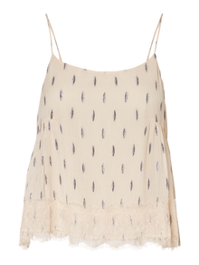 Printed top with spaghetti shoulder straps and lace details at the hem. Style the top with skinny jeans and high heels, when you are going out for drinks with the girls.