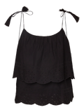 Layered top with embroidered details. The top has adjustable string details with tassels at the shoulders. Style it with a high waisted denim bottom.
