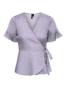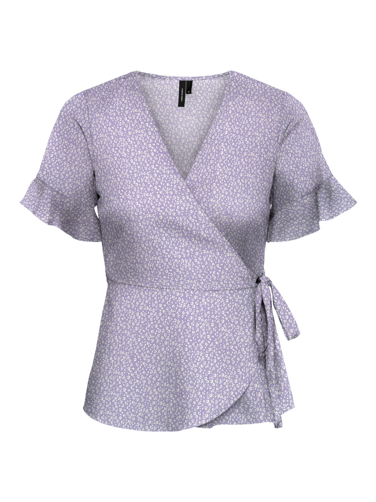 Wrap top with ruffles on the sleeves, a V-neck, and tie-strings in the side. Style this cute top with a pair of jeans and some boots for a stylish look.