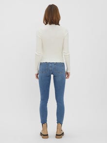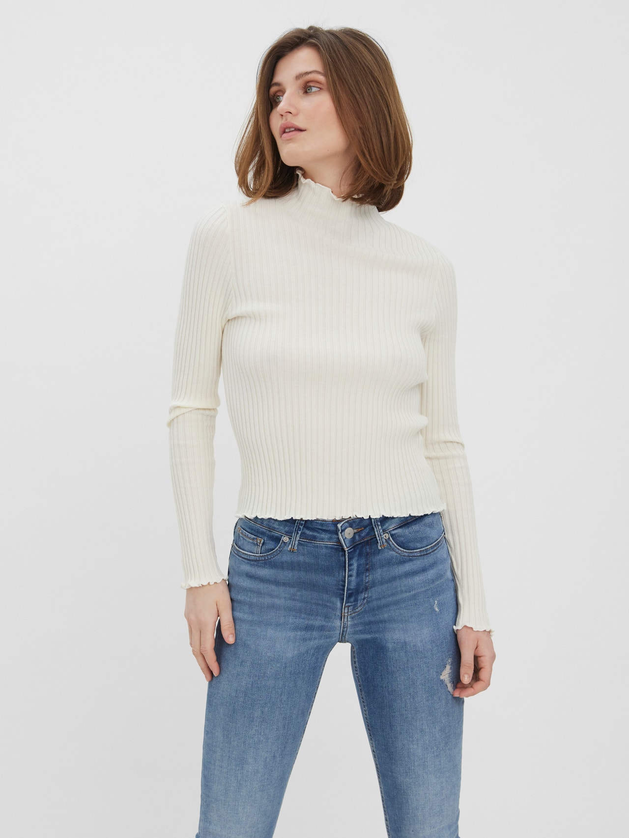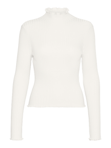 Long-sleeved pullover with a high neck, ribbed structure, and babylock at the neckline, cuffs, and bottom hem. Style this cute pullover with a skirt and a pair of long boots for a cool look.