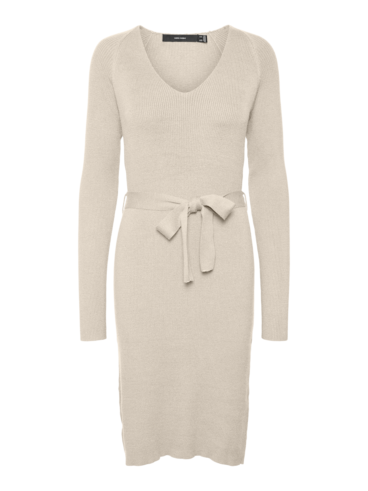 Knitted dress with a fabric belt by the waist, a v-neckline, raw cut cuffs and bottom hem, and an all-over rib structure. Style this stunning dress with some tights and a cool pair of chunky boot for a chic everyday look.