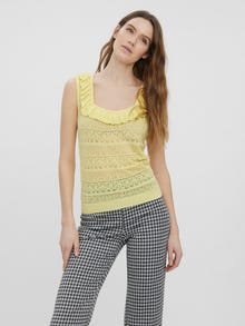 Knitted top with a square neckline, ribbed structure by the bottom hem, and frills by the neckline. Style this cute top with a pair of jeans and some heeled boots for a stylish look.