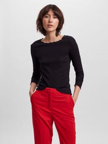 Long-sleeved top in a classic design with baby-lock details by the cuffs, neckline, and bottom hem. Style this top with your wardrobe stables for a cute everyday look.