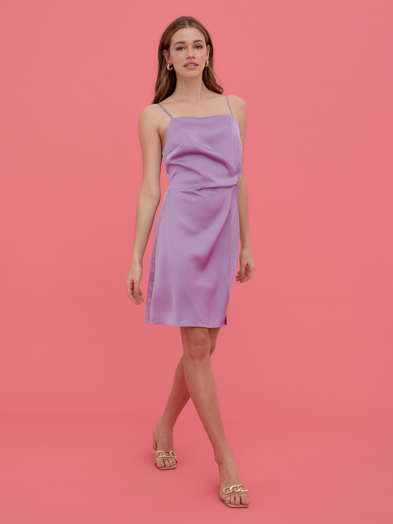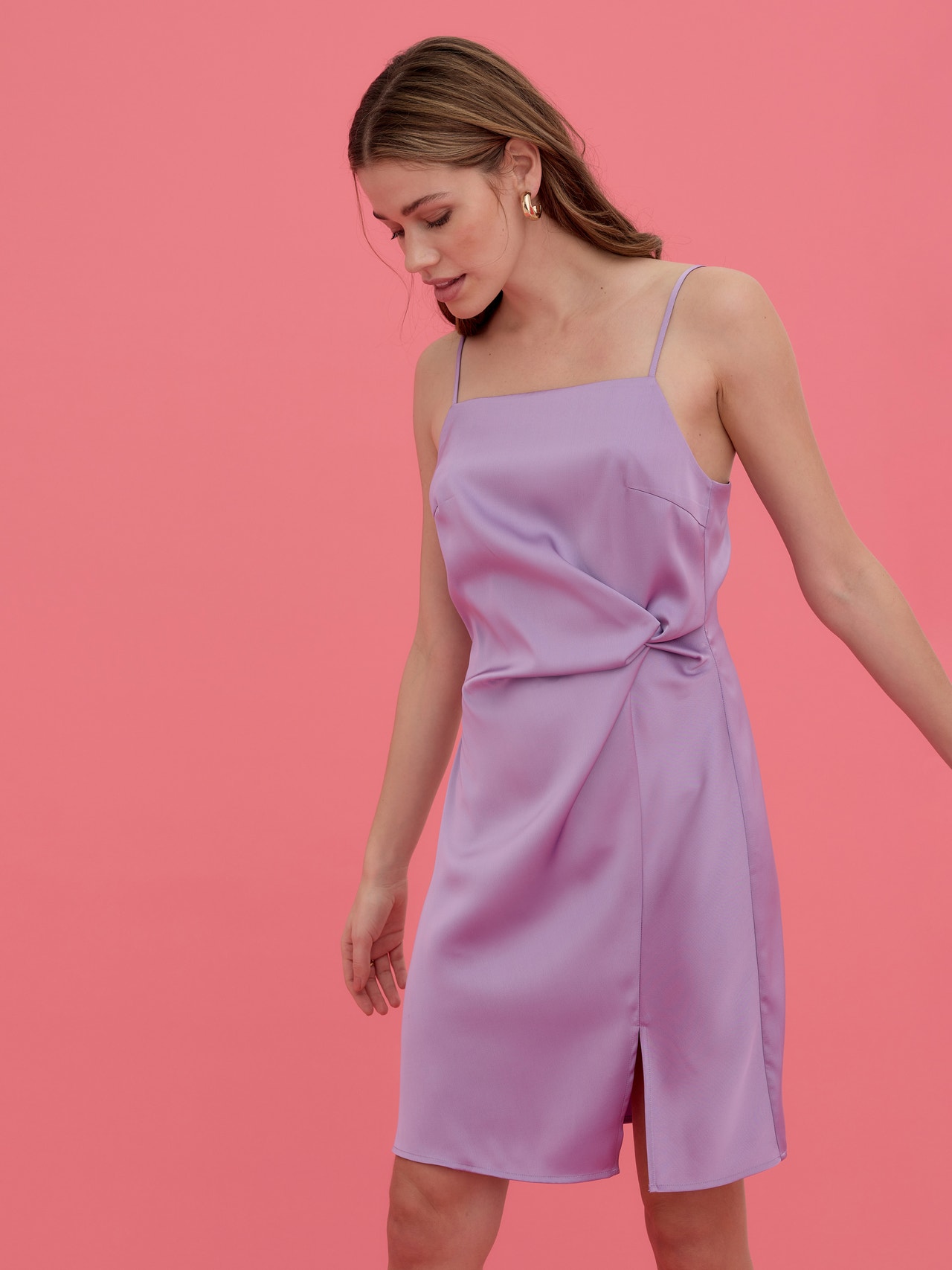 - Mini dress. - Adjustable straps. - Square neckline. - Fabric gatherings by the waist. - Small slit in the front. - Regular fit. - Front length: 90 cm in a size S. - The model is 175 cm tall and wears a size S. Mini dress with a square neckline, adjustable straps, and fabric gatherings by the waist. Style this stunning dress with a pair of heeled boots and some cute accessories for a gorgeous party look.