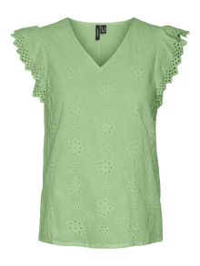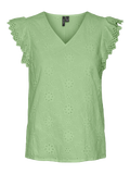 Detailed top with a V-neck, cap sleeves, and embroidery details. Style this cute top with a mini leather skirt and a pair of loafers for a stylish, summer look.