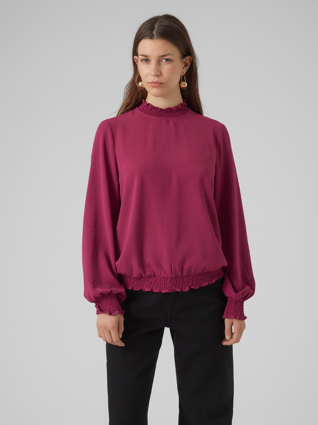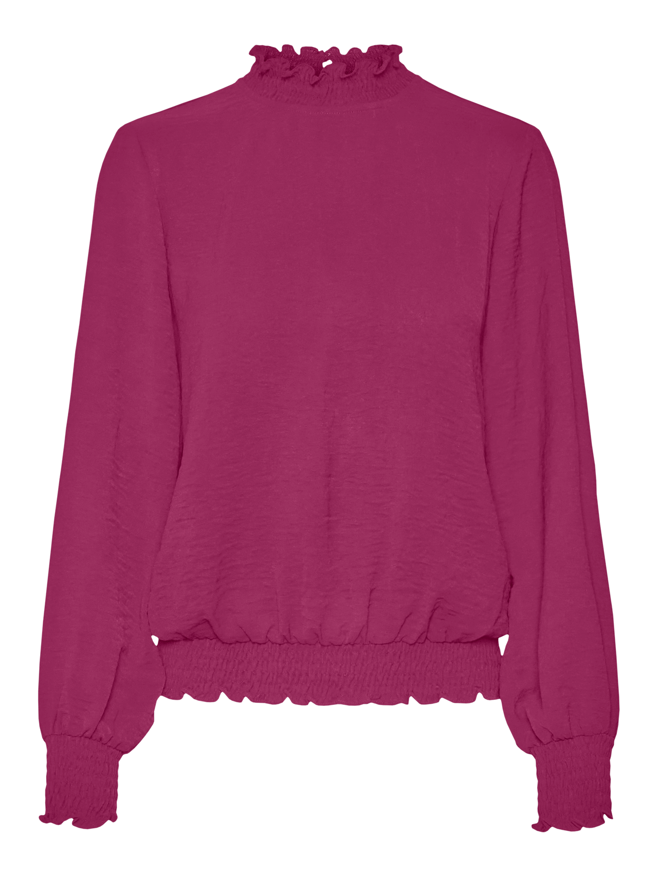 Basics are inevitable to find in almost every wardrobe out there. Our basic tops help bind an outfit together and this top makes no exception. Wear it with a shacket on top, a pair of relaxed mom-jeans, and chunky boots and you get a relaxed and cool everyday look. - Product Type : Top - Neck : High neck - Sleeve : Long sleeves - Cuffs : Elasticated cuffs - Extra details : Frills, Smock detail - Fit : Standard Fit