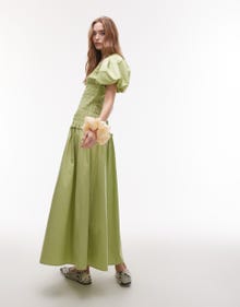 Topshop puff sleeve square neck shirred midi dress in green - LGREEN