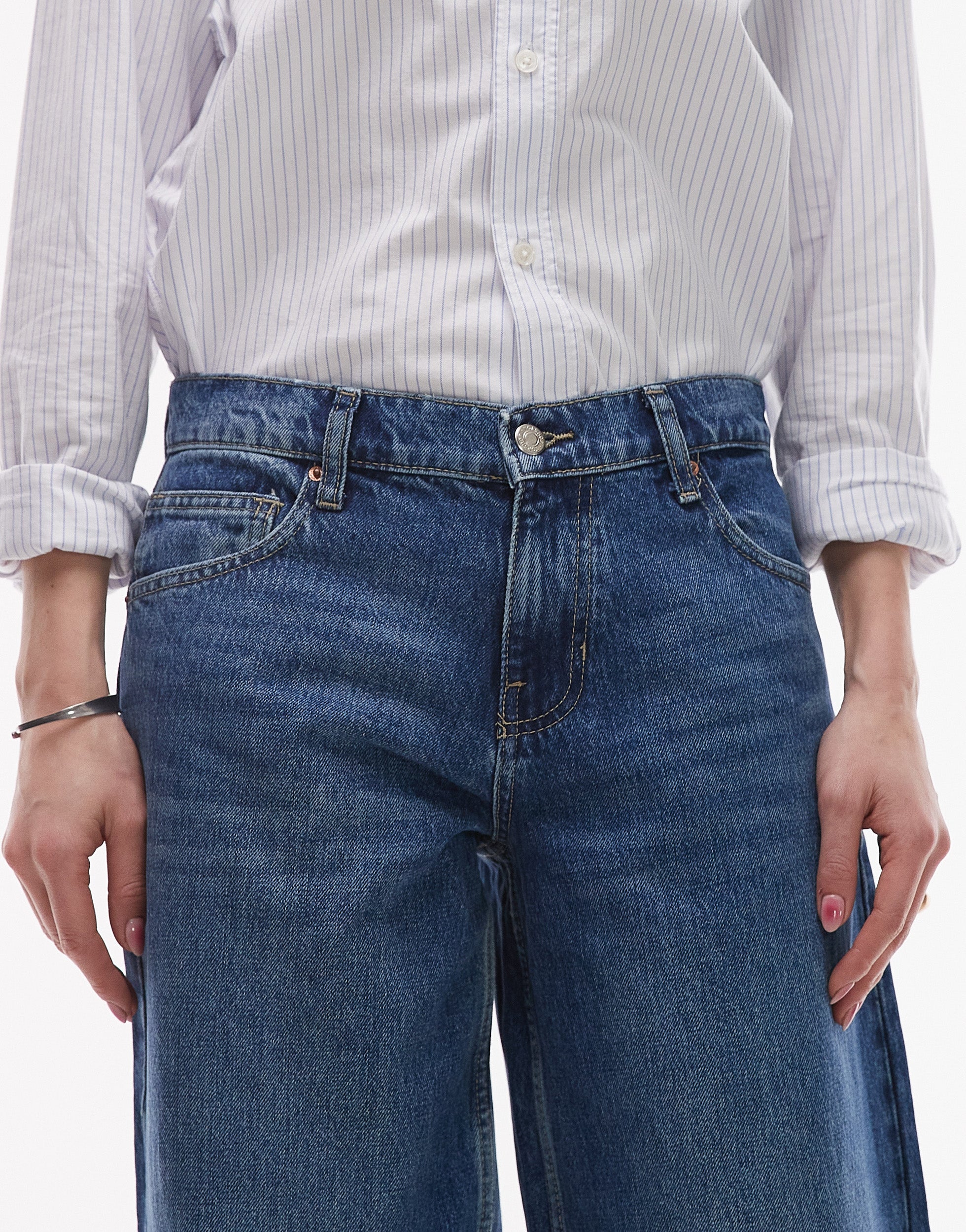 Topshop Cinch low rise relaxed jean in mid blue - MBLUE