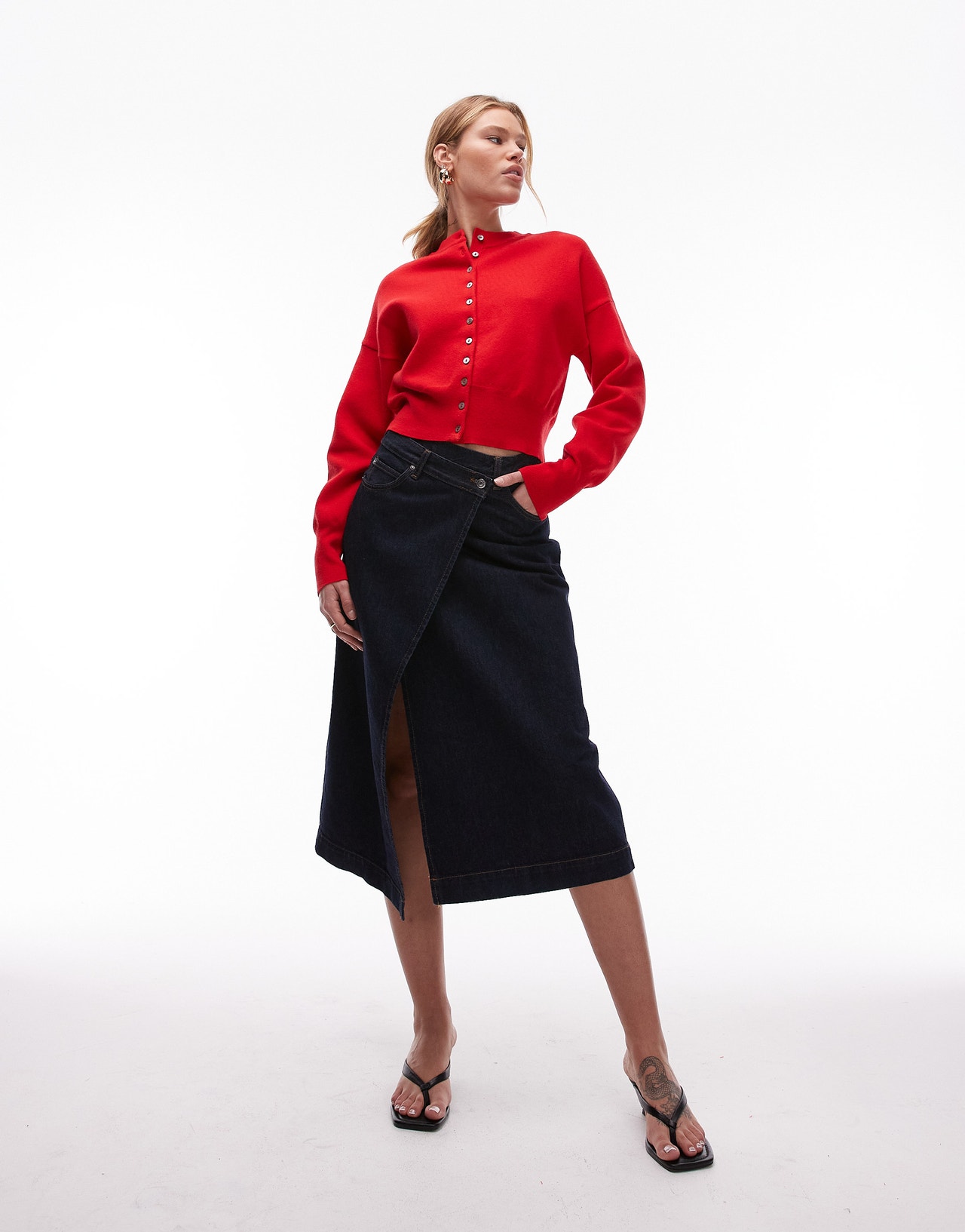 Topshop knitted compact fitted waist cardi in red - RED