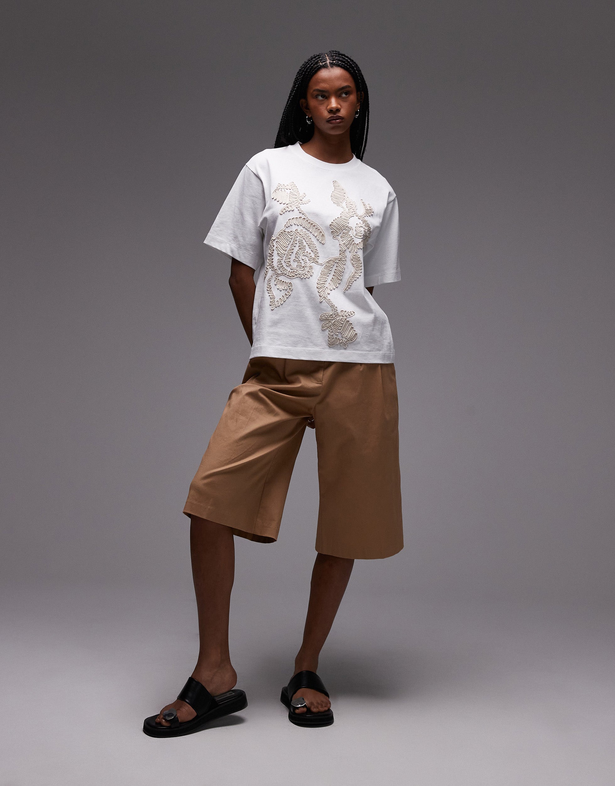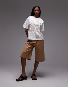 Topshop embroidered floral raffia oversized tee in white - WHITE
