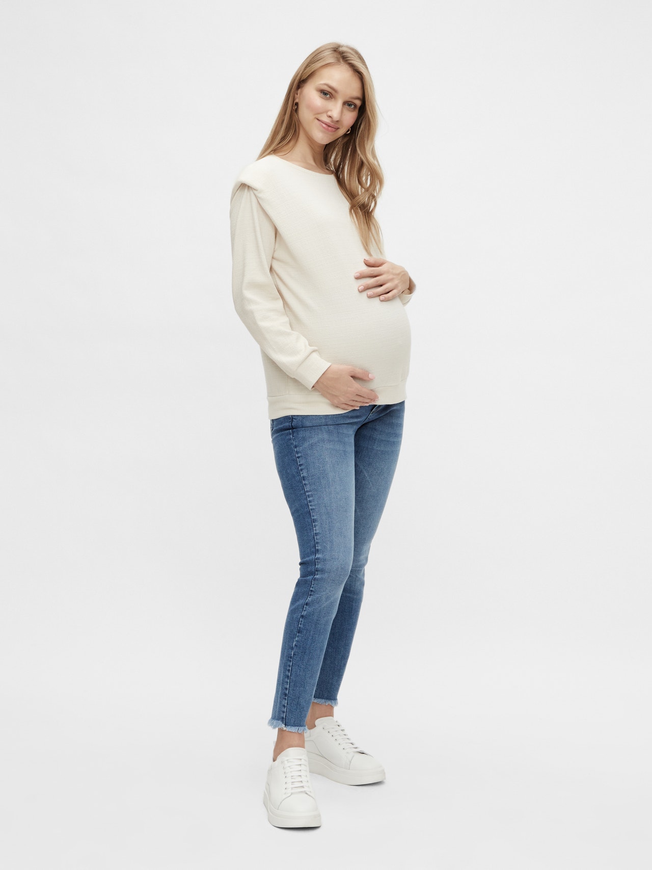 LADIES MATERNITY JEANS BUMP BAND BUTTON, RIVET, FAKE FLY, COIN POCKET, BELT LOOPS POCKET DETAIL SLIM FIT 7/8 LENGHT FRAYED HEMLINE Composition: 98% Cotton - Organic, 2% Elastane BUMP BAND: 79% Cotton, 17% Polyamide, 4% Elastane