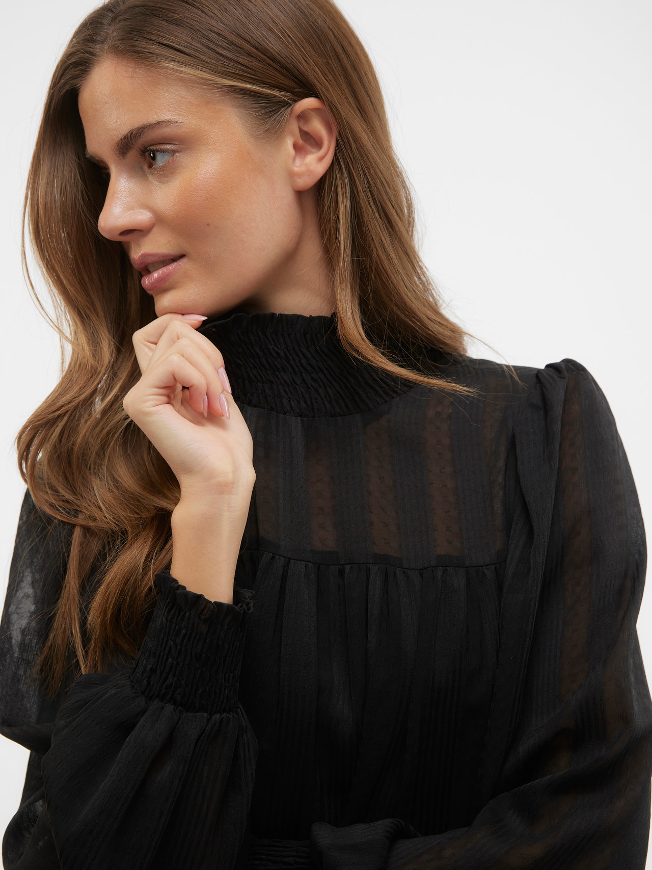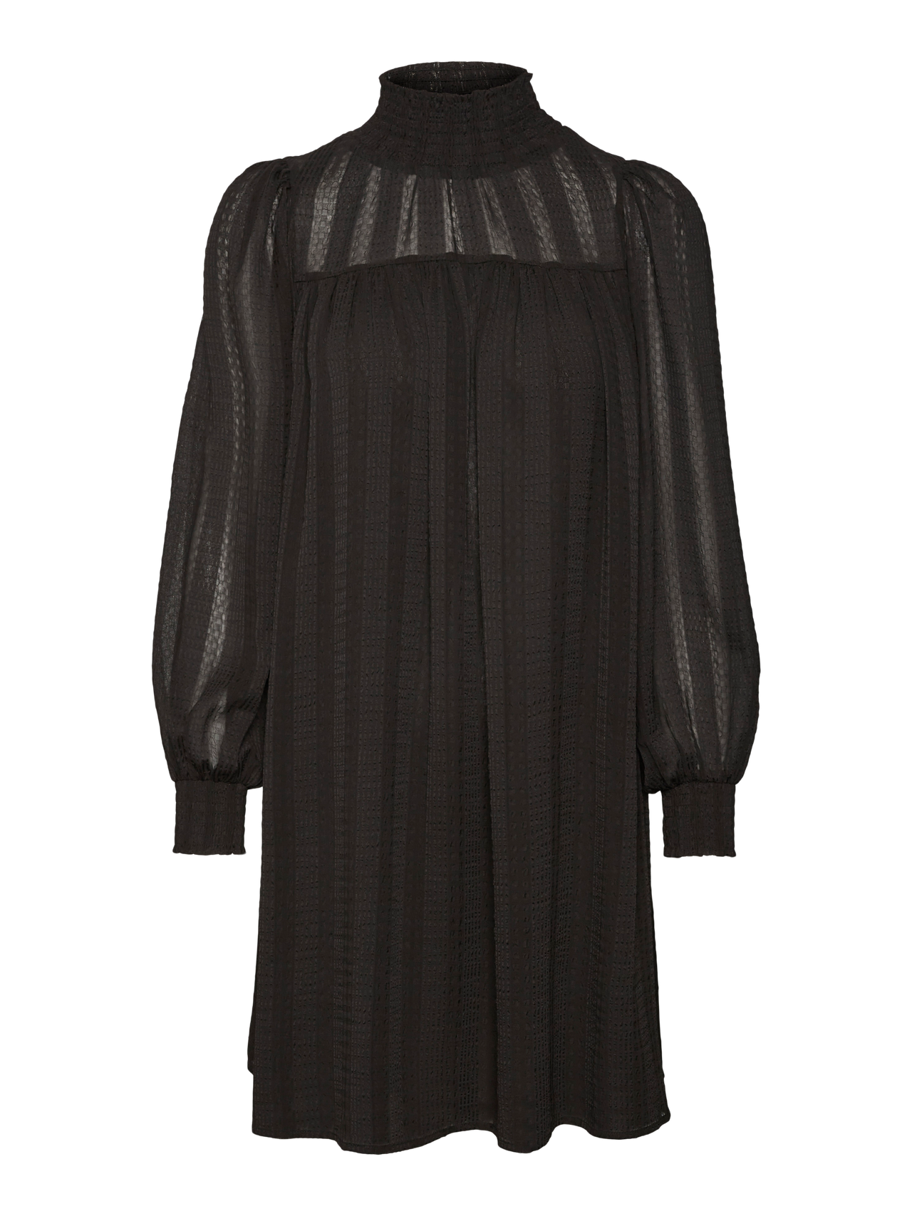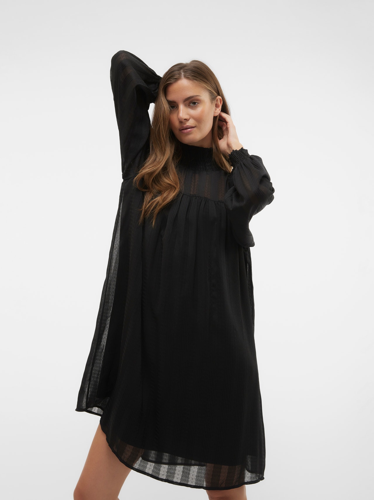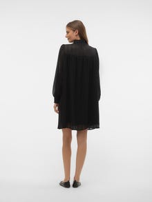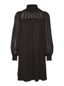 - Toote tüüp : Kleit - Kaelaosa : Kõrge kaelus - Varrukas : Pikad varrukad - Varrukad : Volüümikad varrukad - Mansetid : Kokkutõmmatud mansetid - Pikkus/suurus : Lühike - Vooder : Polüestervooder annab läbipaistmatu ilme - Keha tüüp : - Lõige : Tavapärane lõige
