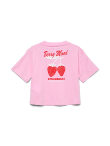 Värskendage oma väikelapse garderoobi armsa topiga tüdrukutele – ideaalne igapäevaselt vajalik ese, mis saadab teda kogu nädala. See stiil sobib ideaalselt peaaegu kõigega ja lisab lõbusust. - Toote tüüp : T-särk - Kaelaosa : Ümmargune kaelus - Varrukas : Lühikesed varrukad - Pikkus/suurus : Kärbitud - Lõige : Suur ja alt lühem lõige