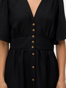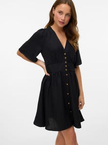 See kleit on ideaalne valik päevadel, mil riietuse sobitamine tundub võimatu. Mugavuse ja stiili ühendamine teeb kleidist igapäevaseks kasutuseks ideaalse riideeseme. Muuda see olenevalt eelistusest uhkemaks või vaoshoitumaks. - Toote tüüp : Kleit - Kaelaosa : V-kaelus - Varrukas : 2/4-varrukad - Lõppsõna : Nööpkinnitus - Pikkus/suurus : Lühike - Lõige : Tavapärane lõige