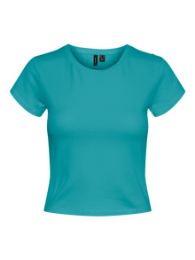Cropped top with a round neckline and short sleeves made from soft and stretchy material. The perfect cropped top that just goes with everything. Style it with a high waisted skirt and a pair of long boots for a stunning look.