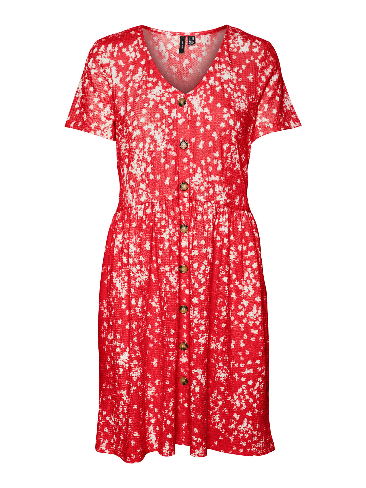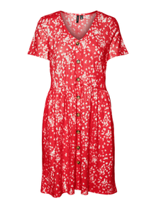 Tämä mekko sopii täydellisesti päiviin, joina asun luominen vaikuttaa mahdottomalta tehtävältä. Mukavuuden ja tyylikkyyden yhdistäminen tekee tästä mekosta täydellisen arjen luottotuotteen. Pue se arkisemmin tai juhlavammin makusi mukaan. - Tuotetyyppi : Mekko - Kaula : V-pääntie - Hiha : Lyhyet hihat - Sulkeminen : Nappikiinnitys - Pituus/koko : Lyhyt - Printtityyppi : Kuvio toistuu kauttaaltaan tuotteen pinnassa - Malli : Regular fit