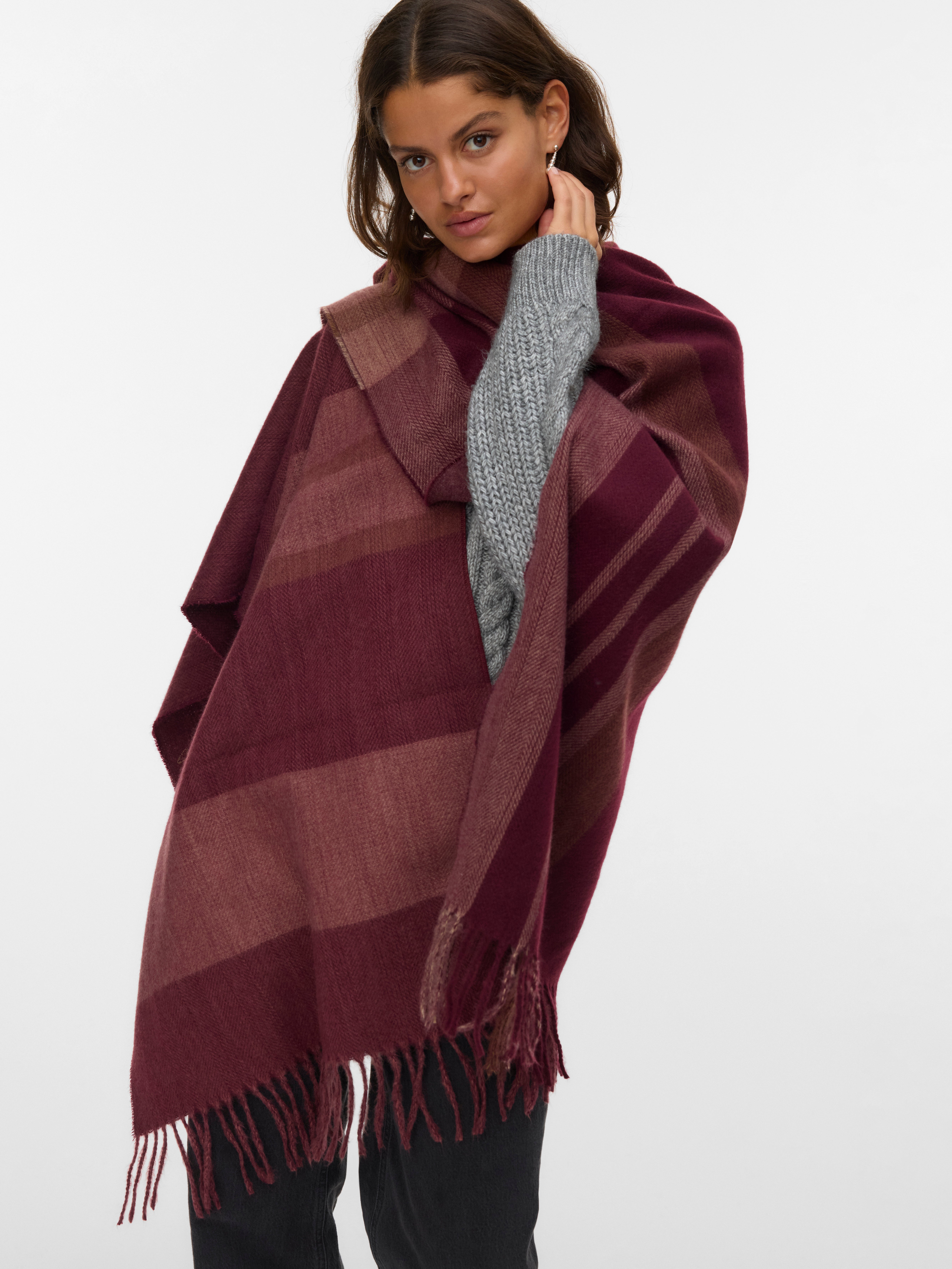 Poncho on mahtava lisäkerros välikausien päiville, kun ilman takkia on kylmä mutta takin kanssa kuuma. Lisää alle ohut pusero tai paksumpi collegepaita kauden mukaan..