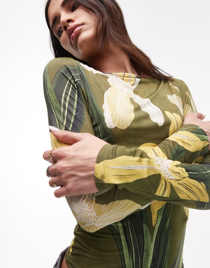 Topshop floral print microfibre long sleeve top in green - MGREEN