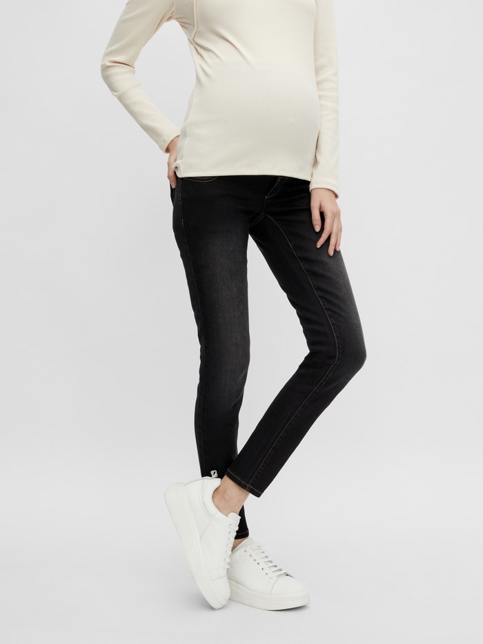 LADIES MATERNITY SLIM FIT JEANS WITH BUMP BAND ATTACHED TO BOTTOM OF WAISTBAND WITH ADJUSTABLE ELASTIC AND BUTTON INSIDE. WAISTBAND WITH BELT LOOPS. BUTTON CF- ABLE TO OPEN. FAKE FLY. FIVE POCKETS WITH RIVETS.