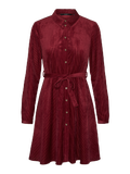 Velvet dress with a button closure in the front, a fabric tie-string at the waist, buttoned cuffs, and a shirt collar. Style this stunning dress with some long boots for a cute everyday look.