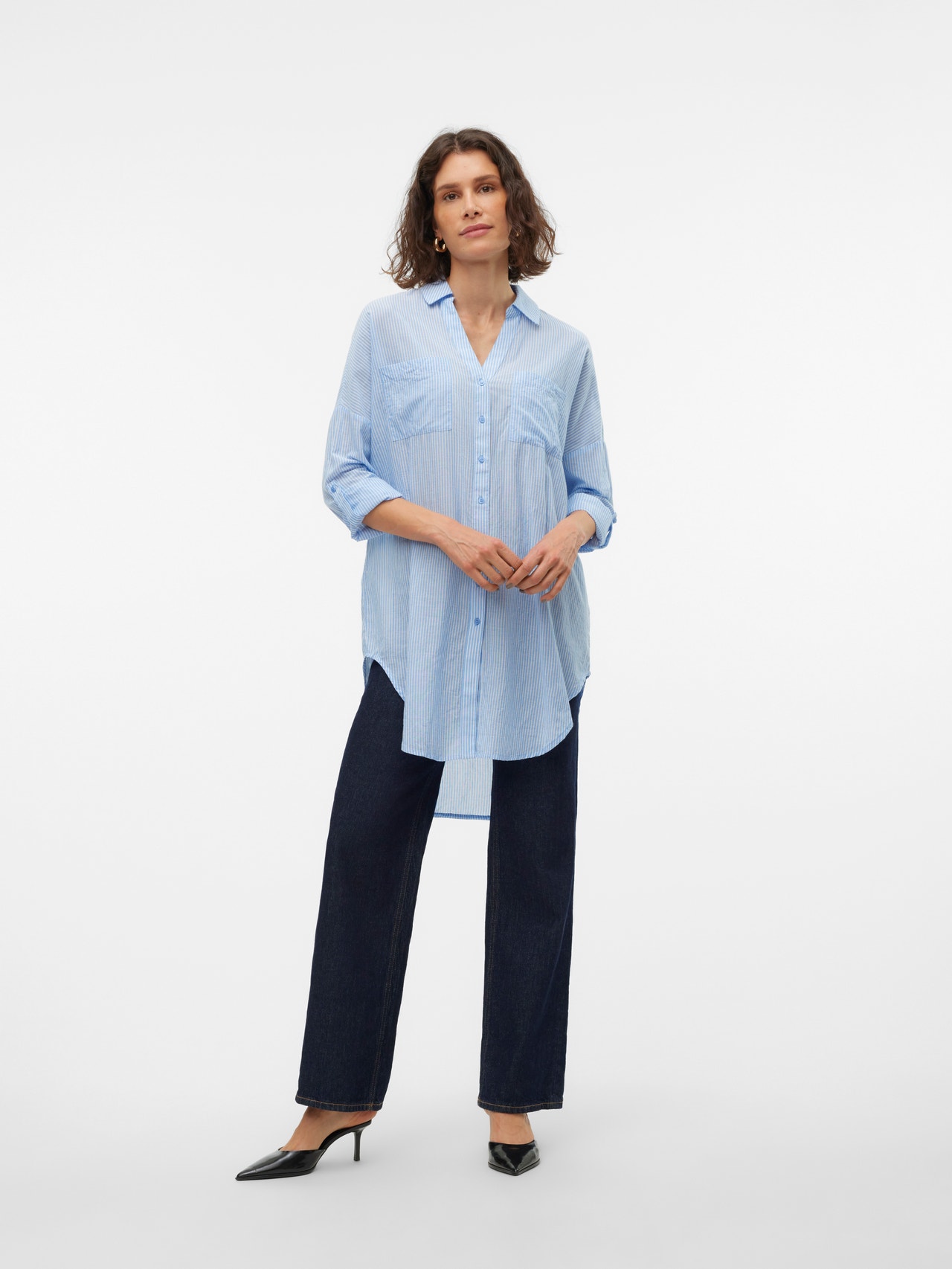 Cette tunique est le mélange parfait entre une chemise et une robe. Portez-la avec un jean skinny les jours de froid ou optez pour un jean moulant lorsque le temps se réchauffe. Ajoutez simplement une paire de belles chaussures à talon pour un look classique de tous les jours. - Type d'article : Blouse - Col : Col en V - Manches : Manches longues - Manches : Épaules tombantes - Poignets : Poignets repliés - Fermeture : Fermeture par bouton - Longueur/Taille : Extra long - Détails : Ourlet incurvé