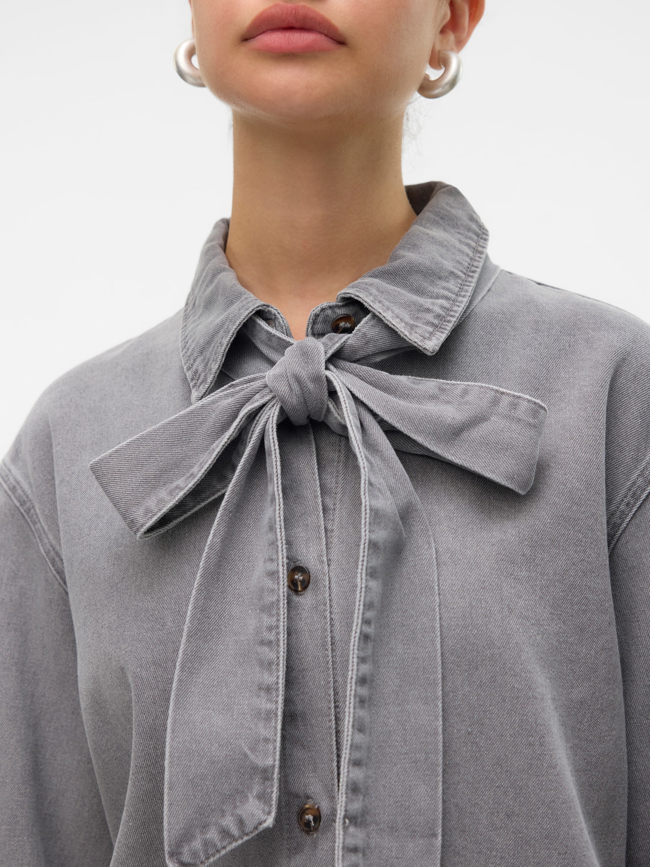 Quelqu'un a dit chemise en jean ? Oui, s'il vous plaît ! Le denim est un véritable classique qui ajoutera toujours une touche cool et sans effort à votre look. Offrez-vous votre nouvelle garde-robe préférée et tombez amoureuse du look denim encore et encore. - Type d'article : Chemise en denim - Col : Col chemise - Manches : Manches longues - Manches : Manches volumineuses - Fermeture : Fermeture par bouton - Détails : Nœud - Coupe : Loose Fit