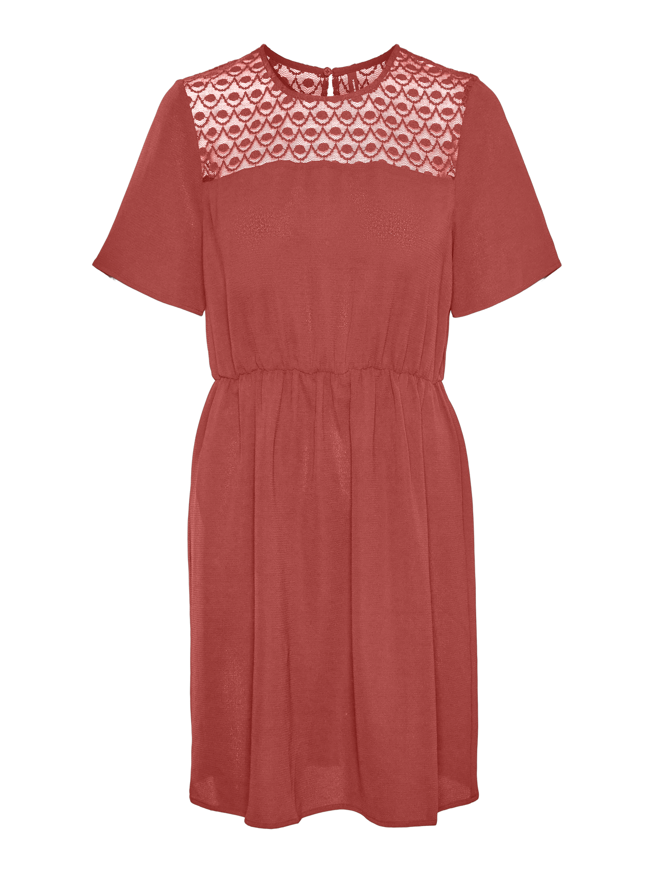 - Short-sleeved dress. - Elastic at the waist. - Round neckline. - Keyhole closure in the back. - Lace detail by the neck. - Regular fit. - Front length: 92 cm in a size S. - The model is 175 cm tall and wears a size S. Shirt-sleeved dress with a round neckline, elastic waist, and keyhole closure in the back. Style this stunning dress with a pair of long boots and some statement jewellery for a stylish look. MADE WITH RECYCLED POLYESTER This product is made with recycled polyester. Recycled polyester saves natural resources and reduces the amount of waste.