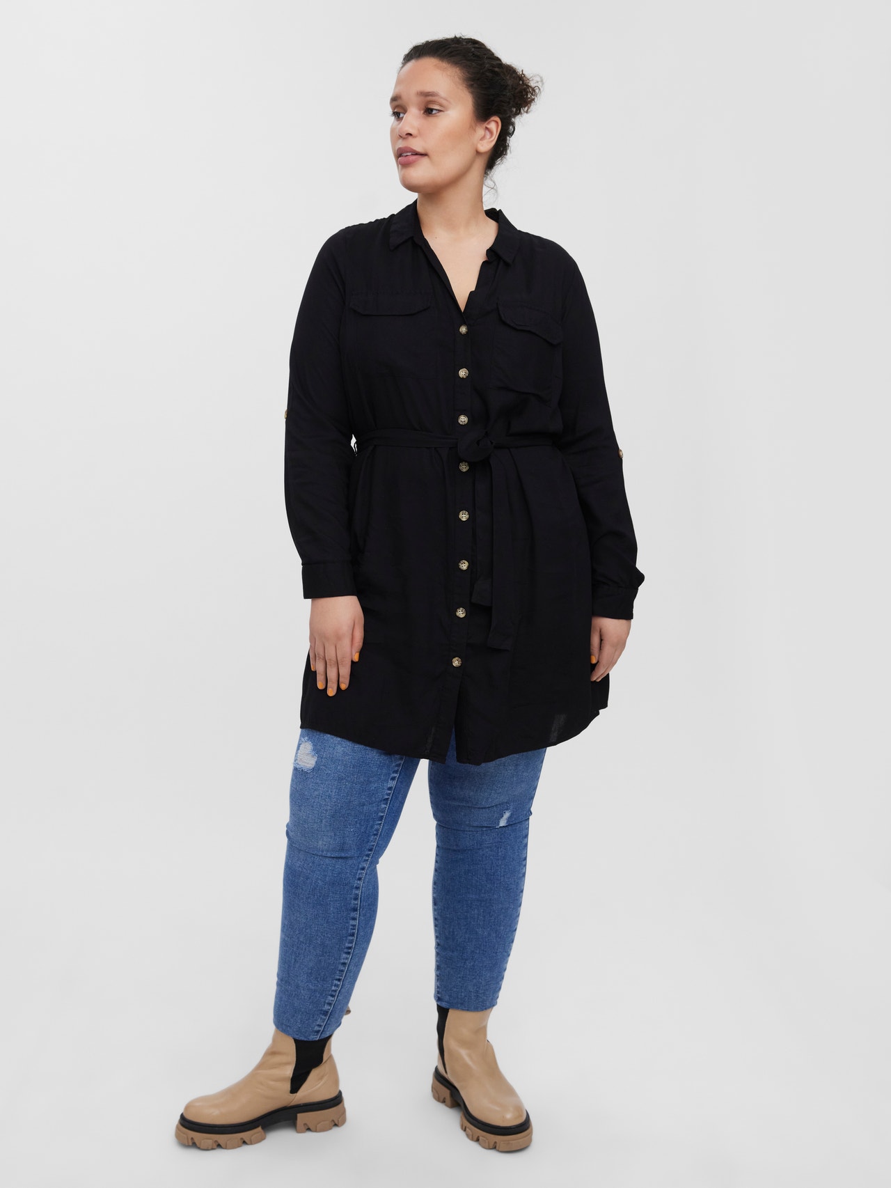 Une robe chemise est à la fois versatile et élégante. Ce style est un incontournable de la garde-robe. Portez-la telle quelle ou associez-la à un jean. Ajoutez une ceinture à la taille pour mettre en valeur votre silhouette. Avec des possibilités de style infinies, cette robe chemise est parfaite pour les jours où vous ne savez pas quoi porter. - Type d'article : Robe chemise - Col : Col chemise - Manches : Manches longues - Poignets : Poignets boutonnés - Détails : Ceinture à la taille - Coupe : Regular Fit