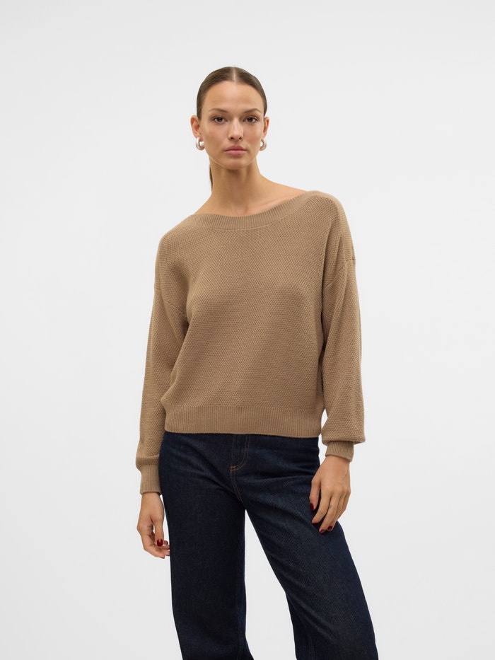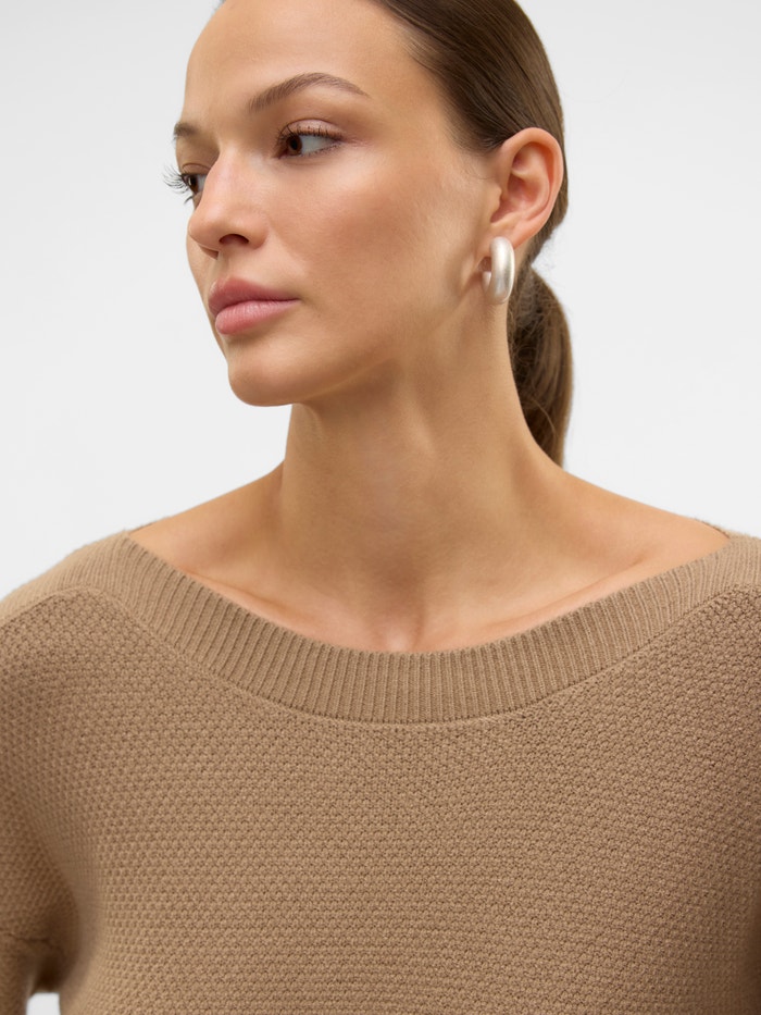 Knitted pullover with a boatneck neckline, dropped shoulders, and rib details by the cuffs. This comfy pullover is the perfect addition to any everyday look. Style it with some skinny jeans and add a chunky pair of boots.