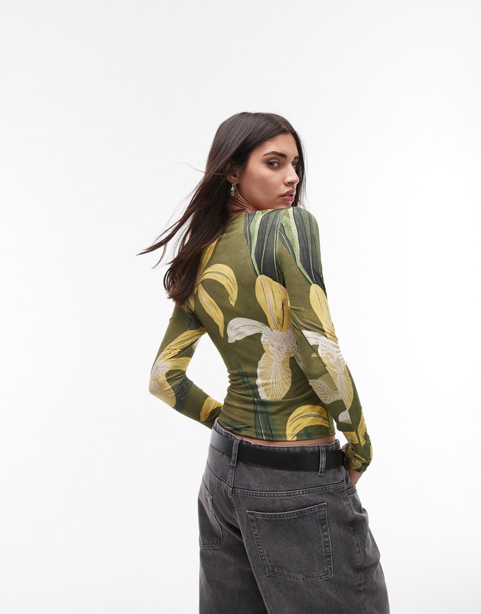 Topshop floral print microfibre long sleeve top in green - MGREEN