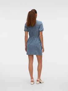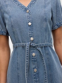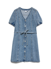 Ova haljina je savršen izbor u danima, gdje se sastavljanje odjeće čini nemogućim. Kombiniranje udobnosti i stila čini ovu haljinu savršenim svakodnevnim izborom. Stilizirajte ga gore ili dolje ovisno o vašem ukusu. - Vrsta proizvoda : Traper haljina - Vrat : V-izrez - Rukav : Kratki rukavi (S/S) - Zatvaranje : Pričvršćivanje remena, Pričvršćivanje gumba - Duljina/veličina : Kratak - Dodatni detalji : Pojas u struku - Pristajati : Standardno pristajanje