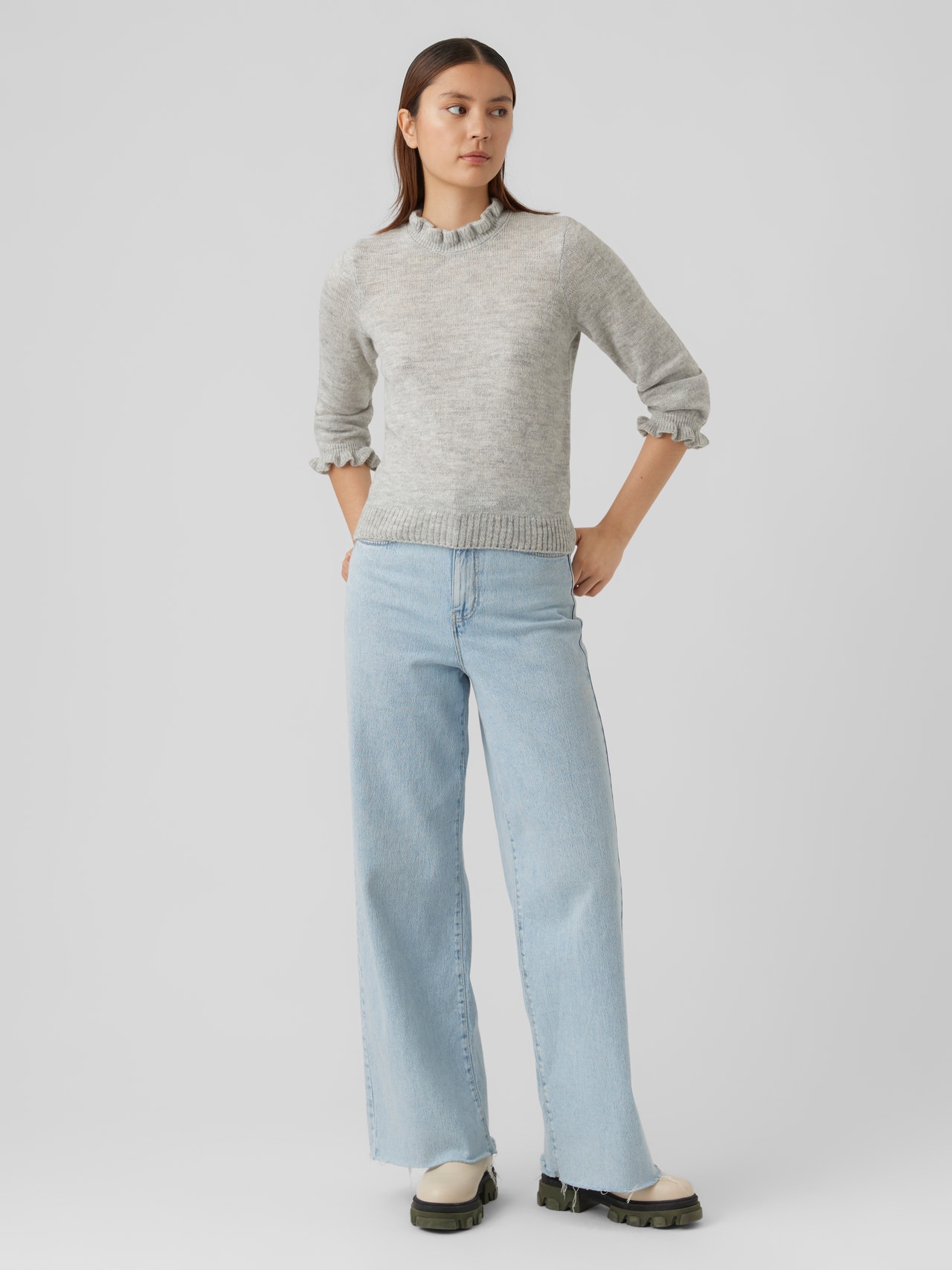 - Knitted blouse. - Rib structure at the bottom hem. - Feminine, ruffles at the cuffs and neckline. - High neckline. - Regular fit. - Front length: 53 cm in a size S. - The model is 175 cm tall and wears a size S. Knitted blouse with a rib structure at the bottom hem, feminine ruffles at the cuffs and neckline, and a high neckline. Style this comfy blouse with a high-waisted skirt, a pair of tights, and some long boots for a stylish everyday look.