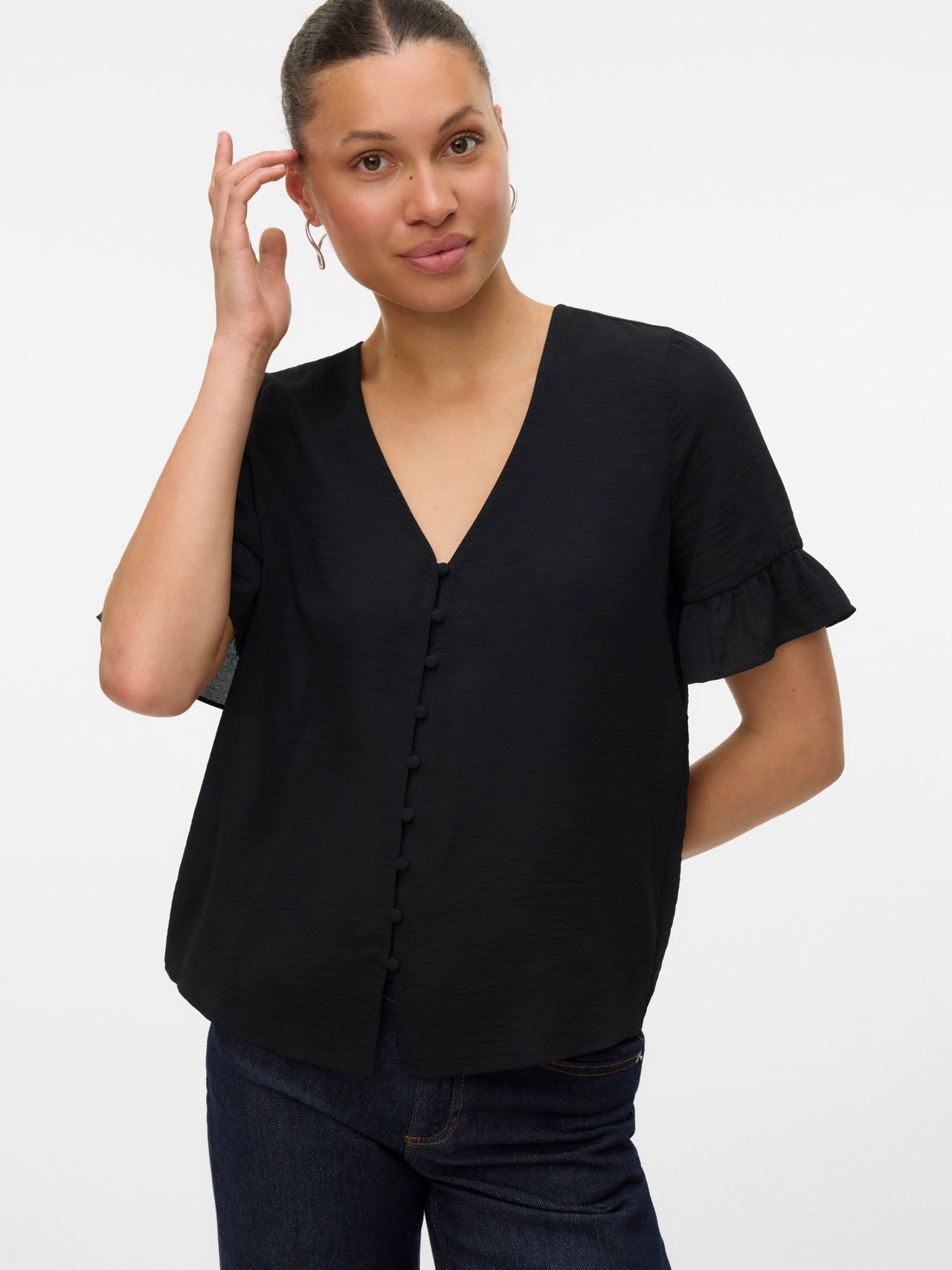 A blúzok a ruhatár legsokoldalúbb darabjai: szinte mindennel, például farmerrel, nadrággal és szoknyával is kombinálhatók. Ez a darab sem kivétel. Ezzel a blúzzal pillanatok alatt kifinomult megjelenést varázsolhatsz magadnak. - Terméktípus : Blúz - Nyak : V-nyak - Ujj : 2/4-es ujjú - Ujjak : Bő ujj - Hajtóka : Ráncolt mandzsetta - Lezárás : Gombos záródás - További részletek : Fodrok - Forma : Hagyományos - Életmód : Karácsony, Szabadidő