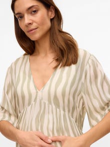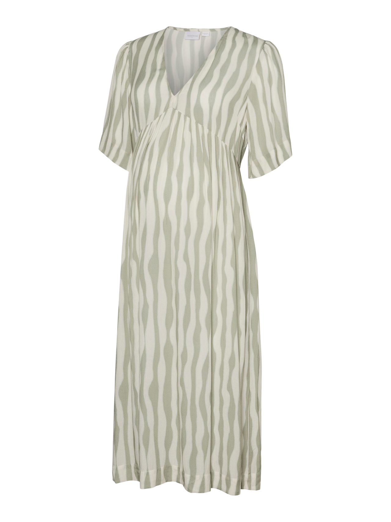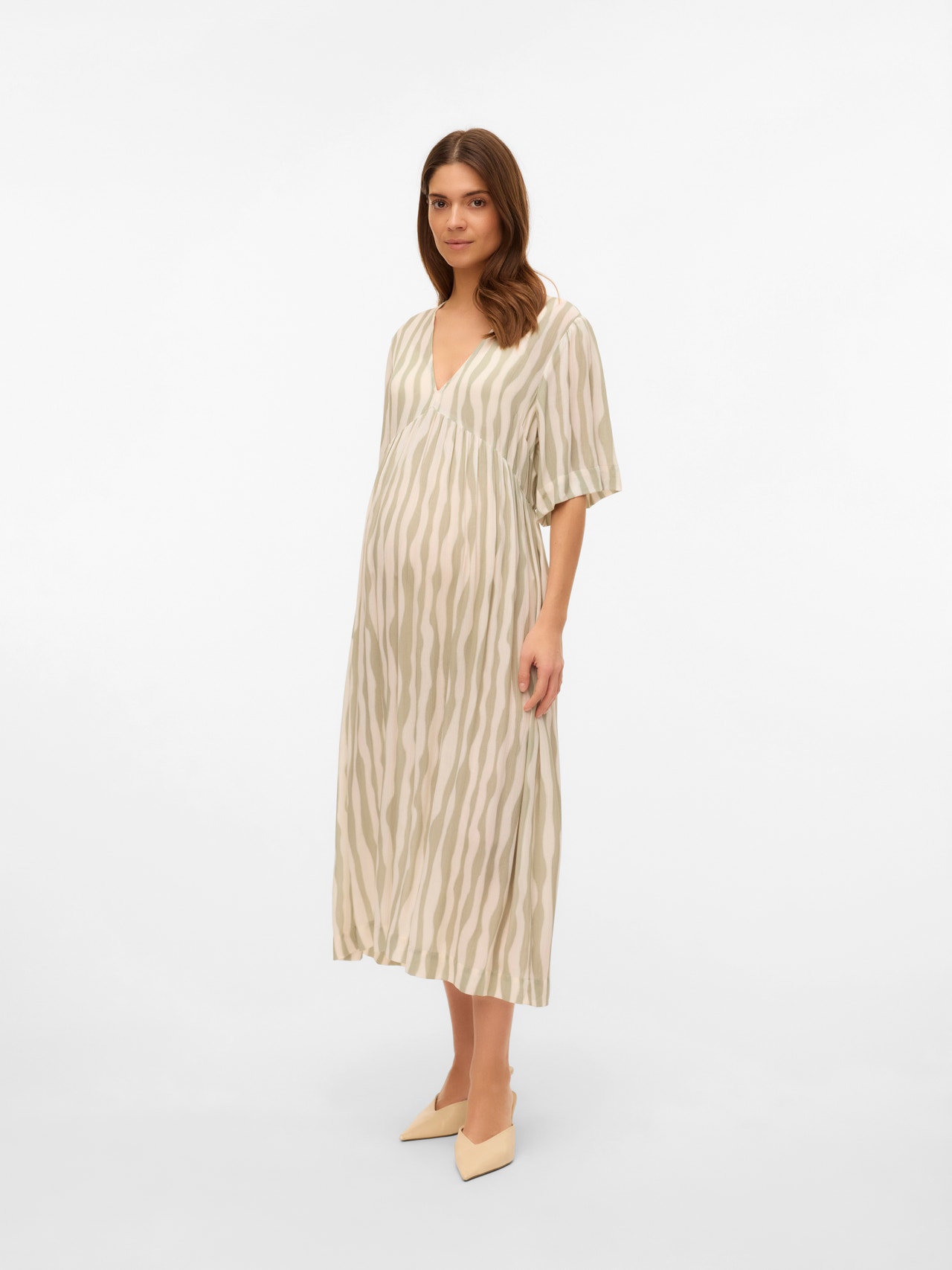 Készülj fel az új kezdetre gyönyörű és puha tavaszi darabjainkkal, amelyek tökéletesen illeszkednek a növekvő pocakodhoz, és színt és könnyedséget visznek a megjelenésedbe. - Terméktípus : Ruha - Nyak : V-nyak - Ujj : 2/4-es ujjú - Ujjak : Bő ujj - Hossz/méret : Midi hoszz - További részletek : Vonal a has felett, Vonal a deréknál, Rugalmas derékrész, Ráncos rész - Nyomott : A minta a termék teljes felületén megtalálható - Forma : Hagyományos