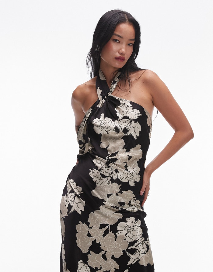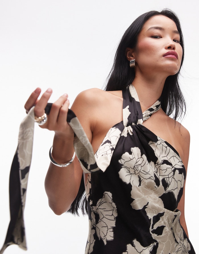 Topshop tie neck halter in black ivory floral - IVORY