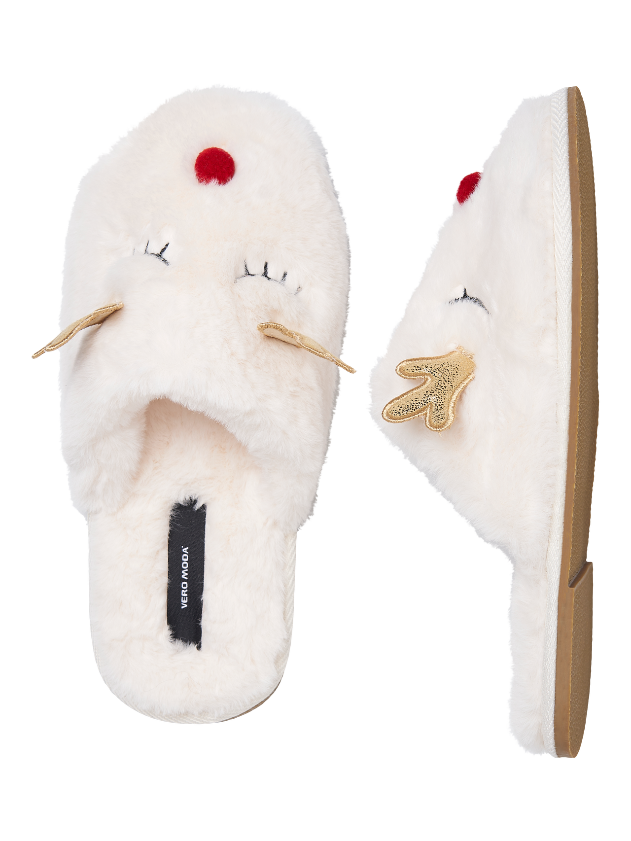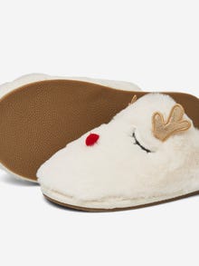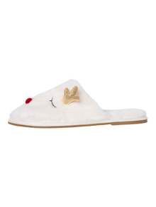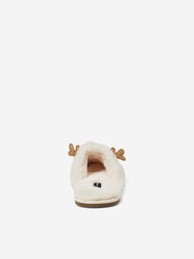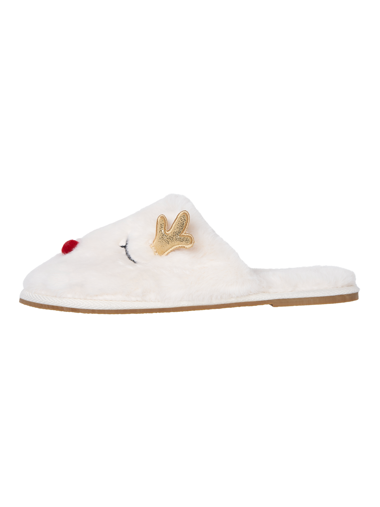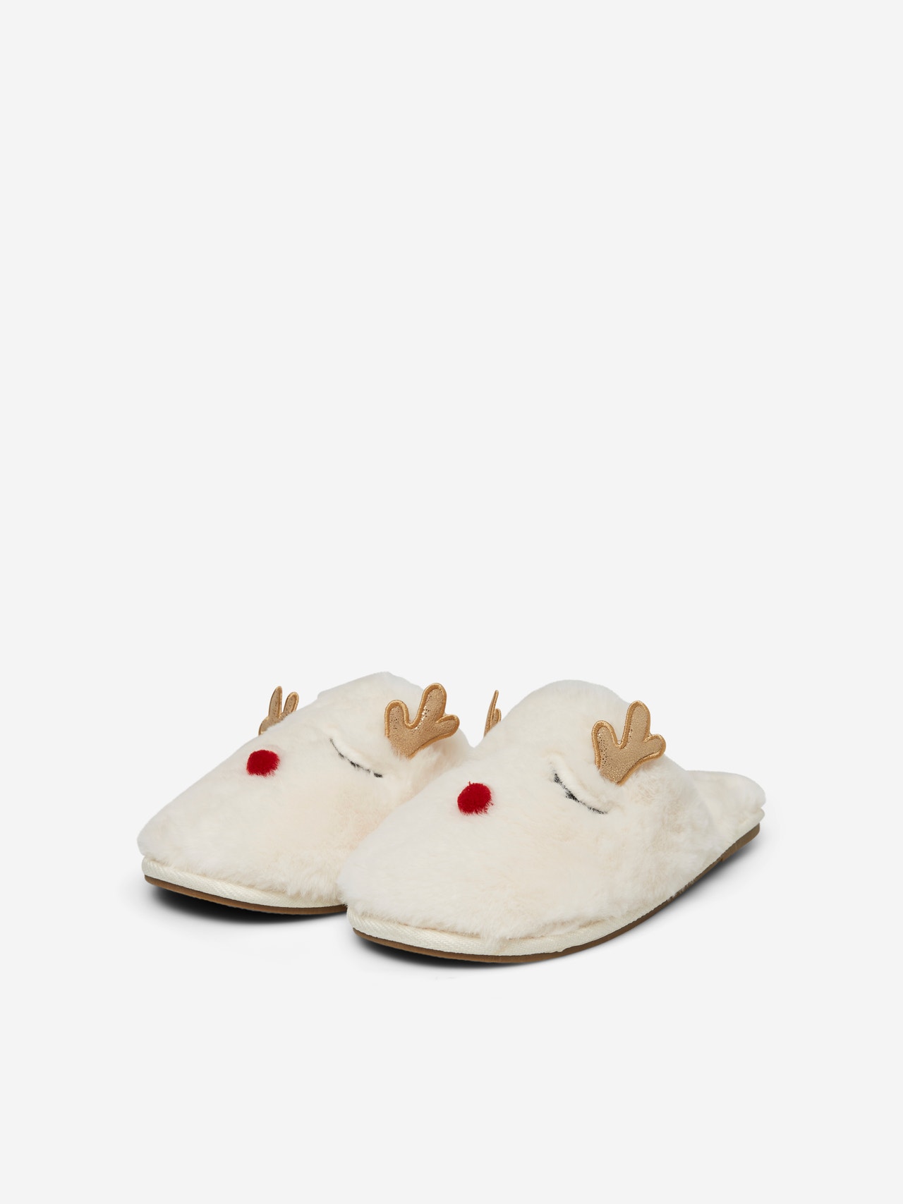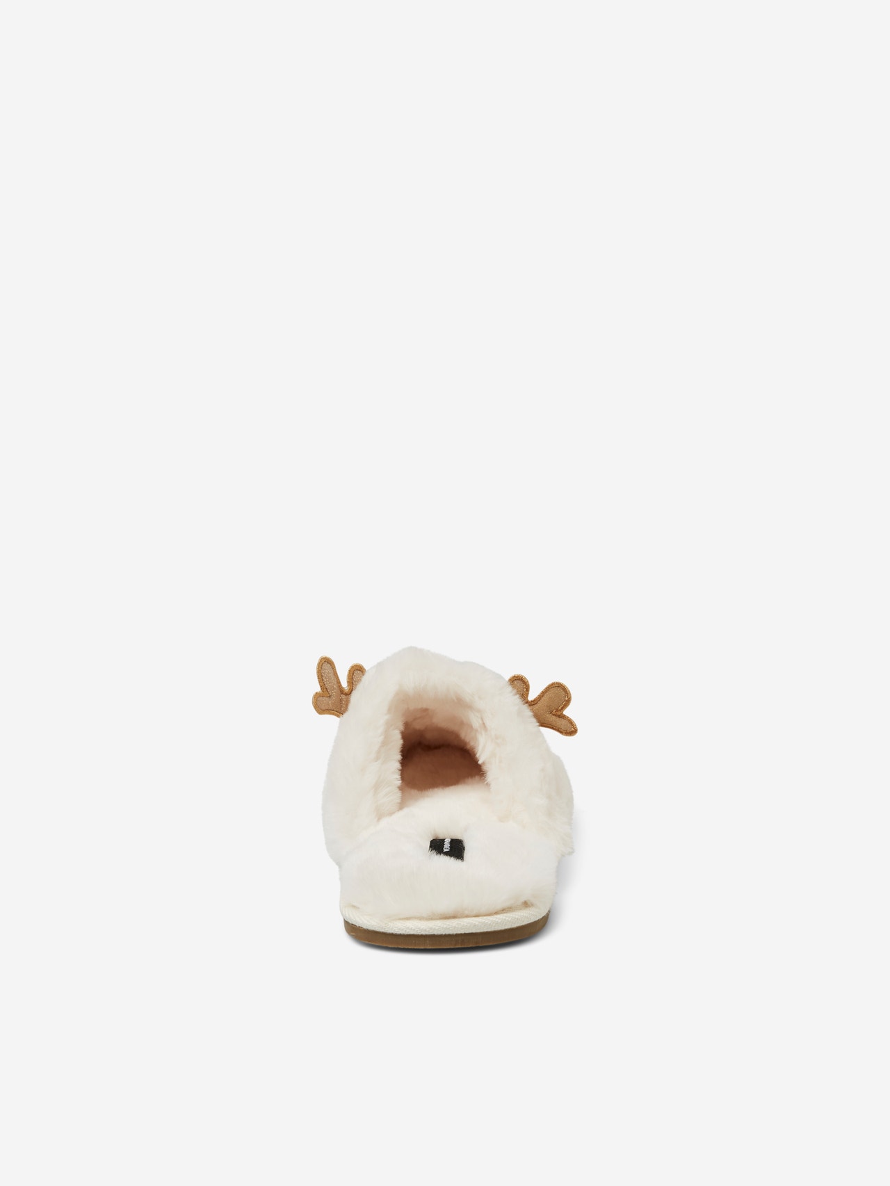 - Faux fur slippers. - Reindeer design. - Slip-on style. - Round toe. - Open back. Faux fur slippers in a reindeer design. The slippers has round toe and open back. Wear them with a dressing gown, when you get ready for a Christmas party.
