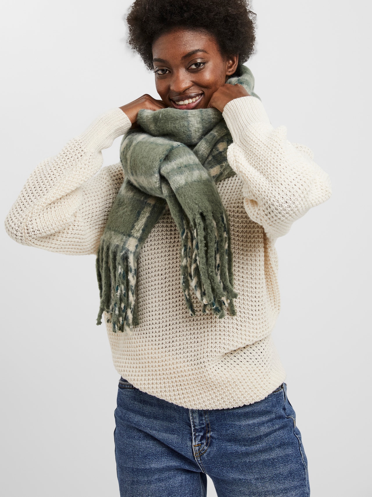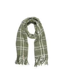 Long knitted scarf in a checked print with tassel trims. Pair the scarf with your favourite winter jacket and a cute hat to stay warm throughout the winter.